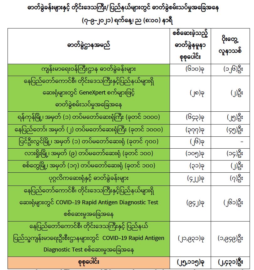 သို့ဖြစ်ပါ၍ ယနေ့အထိ ဓာတ်ခွဲနမူနာစုစုပေါင်း(၃,၈၃၁,၃၃၆)ခုအား စစ်ဆေးခဲ့ပြီး COVID-19 ဓာတ်ခွဲအတည်ပြုလူနာ စုစုပေါင်း (၄၂၀,၄၀၂) ဦး ရှိပြီ ဖြစ်ပါသည်။