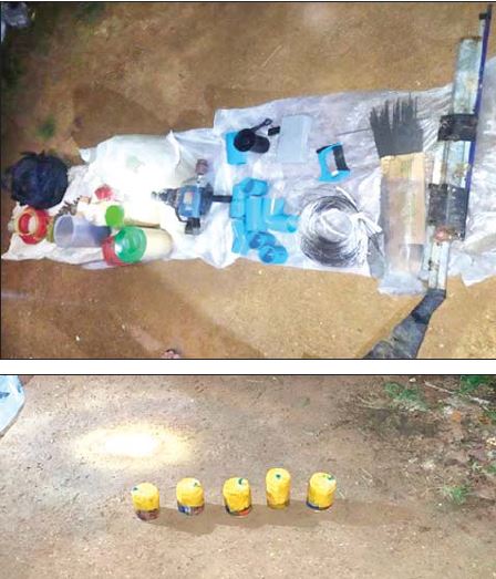 ပေါက်ကွဲသည့်ဝန်းကျင်တွင် လက်လုပ်မိုင်း ငါးလုံး၊ ဒီတိုနေတာ အခု ၃၀ ယမ်းကြိုး(အမြန်) ၂၇ မီတာနှင့် ဖောက်ခွဲရာတွင် အသုံးပြုသည့် ဆက်စပ်ပစ္စည်းများနှင့်အတူ ဖမ်းဆီးရမိခဲ့ကြောင်း သိရ သည်။