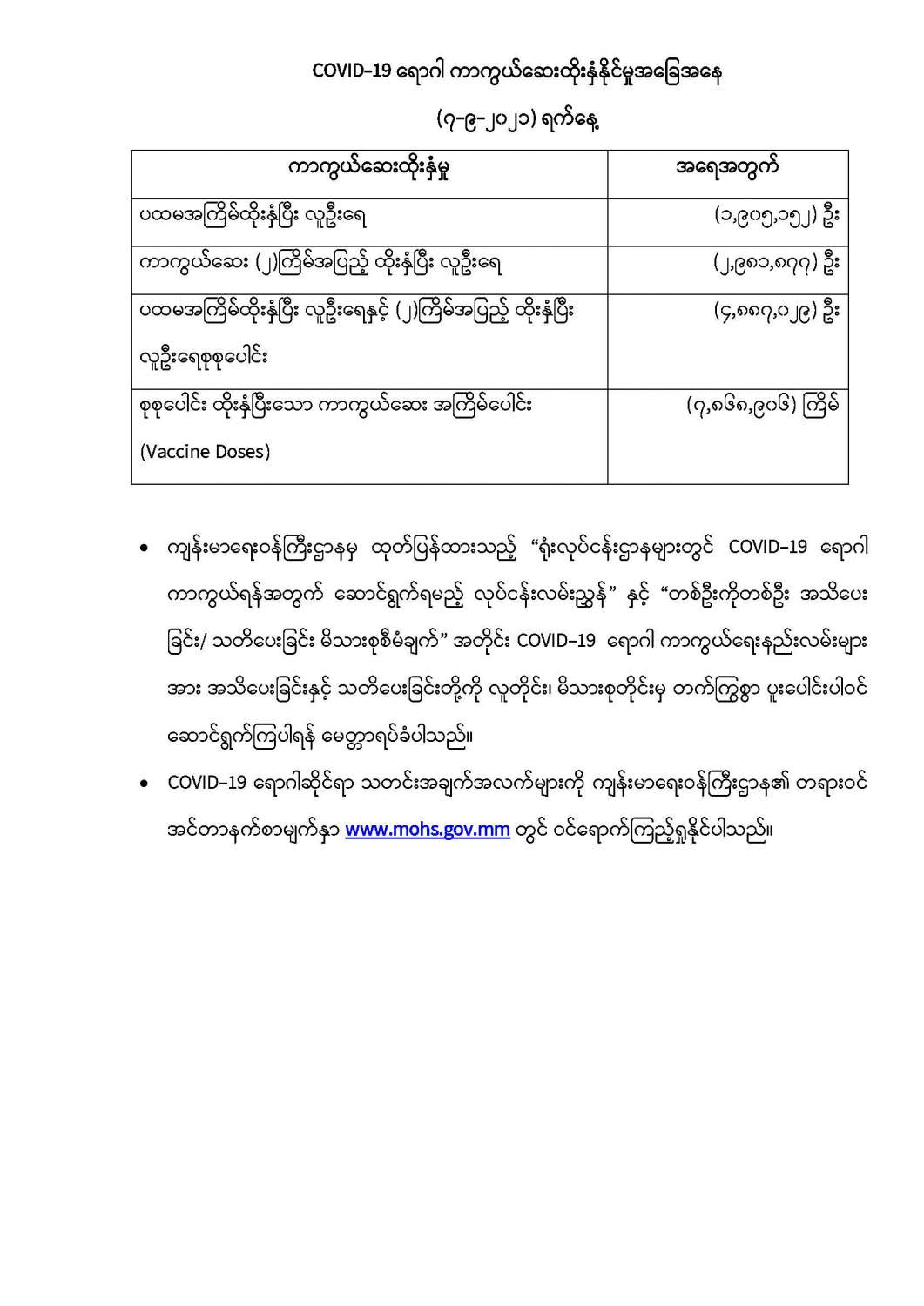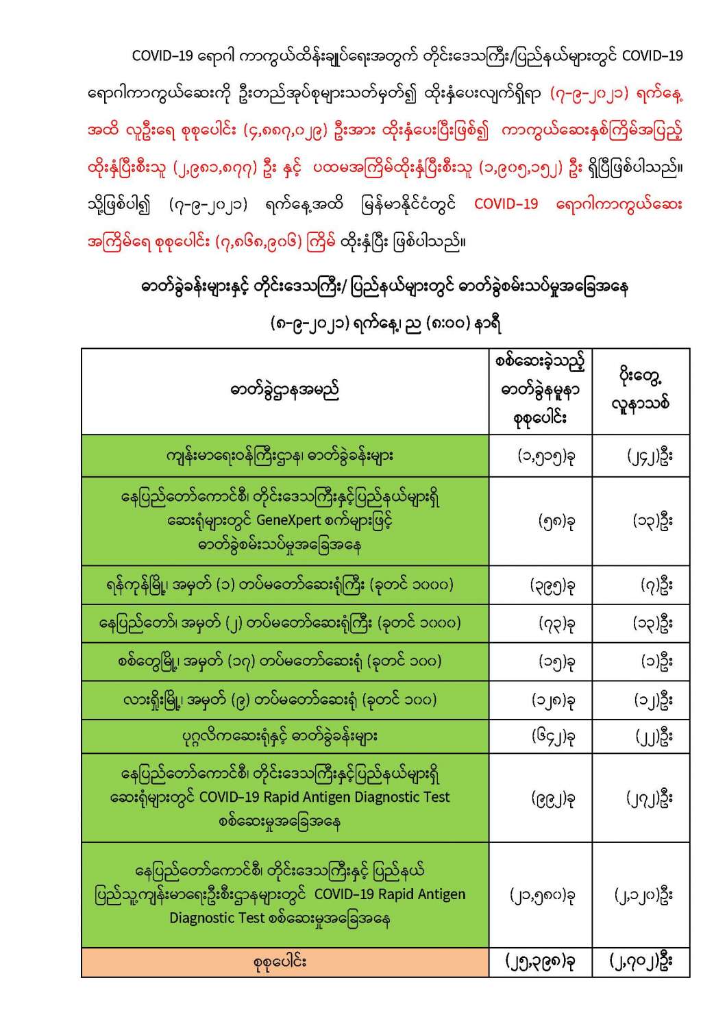 COVID-19 ရောဂါစောင့်ကြပ်ကြည့်ရှုမှုနှင့်ပတ်သက်၍သတင်းထုတ်ပြန်ခြင်း (၈-၉-၂၀၂၁) ရက်နေ့၊ ည (၈:၀၀)နာရီ 09/08/2021