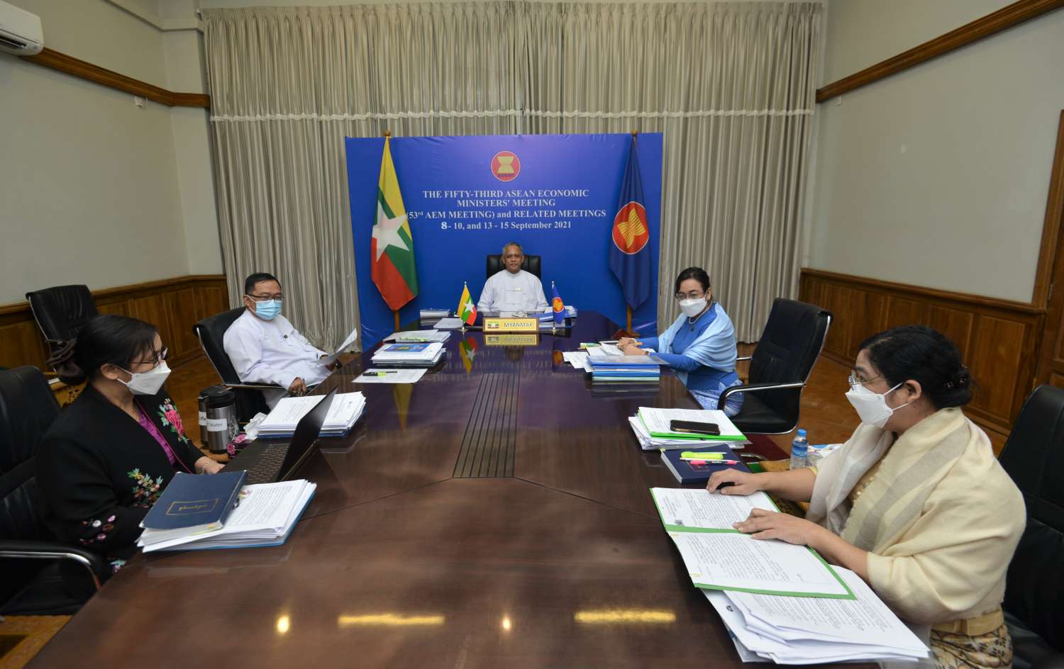 (၅၃) ကြိမ်မြောက် အာဆီယံစီးပွားရေးဝန်ကြီးများ အစည်းအဝေး ဒုတိယနေ့ကို ဗီဒီယို ကွန်ဖရင့်စနစ်ဖြင့် ဆက်လက်ကျင်းပခဲ့ရာ ရင်းနှီးမြှုပ်နှံမှုနှင့် နိုင်ငံခြားစီးပွားဆက်သွယ်ရေး ဝန်ကြီးဌာန၊ ပြည်ထောင်စုဝန်ကြီး ဦးအောင်နိုင်ဦးသည် နေပြည်တော်ရှိ ရင်းနှီးမြှုပ်နှံမှုနှင့် နိုင်ငံခြားစီးပွား ဆက်သွယ်ရေးဝန်ကြီးရုံးမှ  ပါဝင်တက်ရောက်သည်။