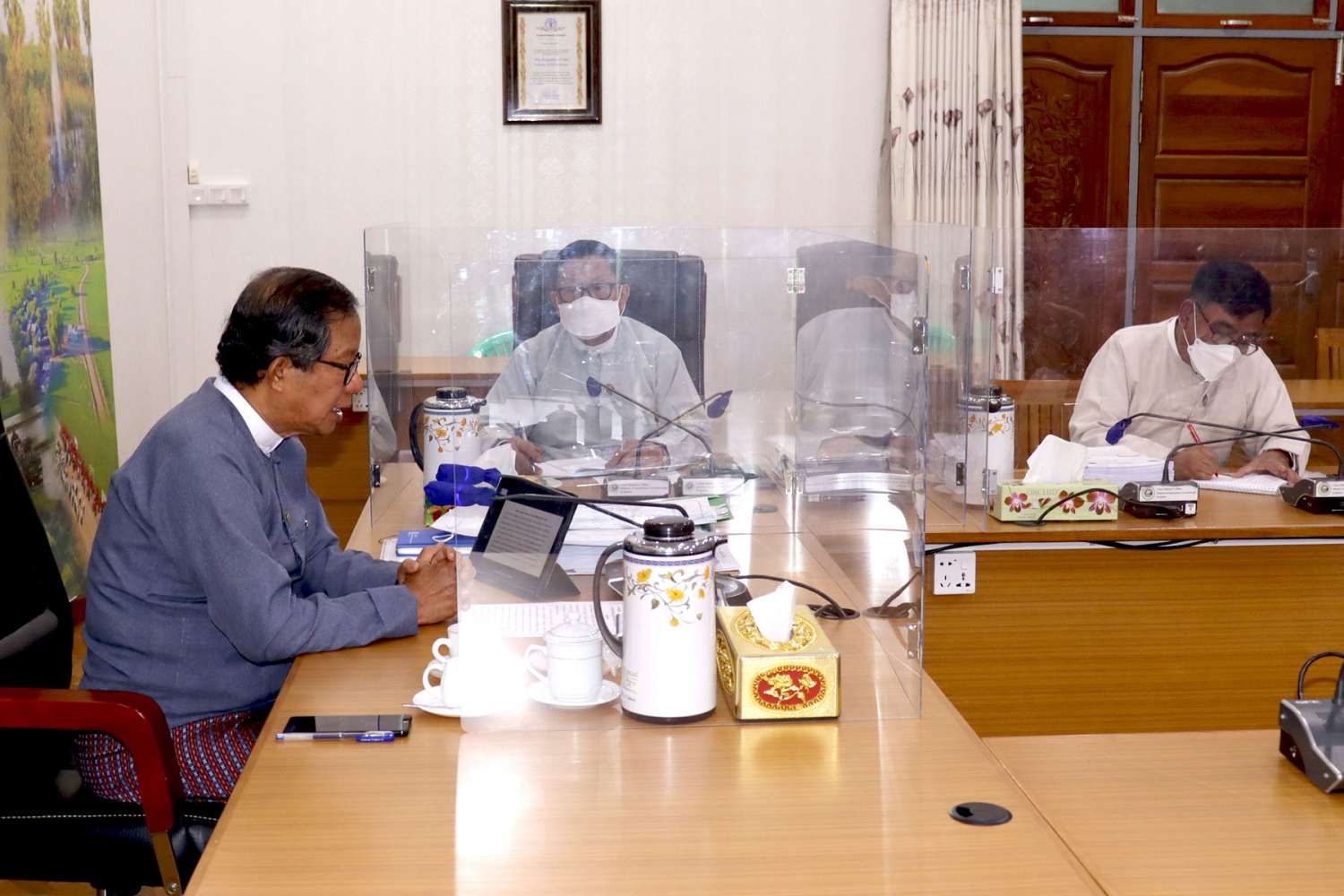 ဆက်လက်၍ ဒုတိယဝန်ကြီး အမြဲတမ်းအတွင်းဝန်နှင့် သက်ဆိုင်ရာတာဝန်ရှိသူများက စိုက်ပျိုး ရေး ထွက်ကုန်များ၏ တန်ဖိုးကွင်းဆက်မြှင့်တင်ရေးနှင့် တောင်သူတစ်ဦးချင်း စိုက်ပျိုးမြေ တစ်ဧကချင်း၏ ထုတ်လုပ်မှုစွမ်းအားတိုးတက်ရေးအတွက် လုပ်ငန်းကဏ္ဍများအလိုက် ဆွေးနွေးခဲ့ကြသည်။