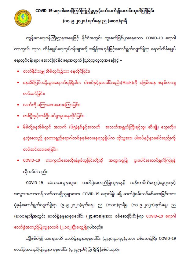 COVID-19 ရောဂါစောင့်ကြပ်ကြည့်ရှုမှုနှင့်ပတ်သက်၍သတင်းထုတ်ပြန်ခြင်း (၁၀-၉-၂၀၂၁) ရက်နေ့၊ ည (၈:၀၀)နာရီ 09/10/2021