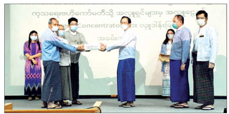 ထို့နောက် ပြည်ထောင်စုရွေးကောက်ပွဲ ကော်မရှင်ဥက္ကဋ္ဌ ဦးသိန်းစိုးနှင့် အဖွဲ့ဝင်များ၊ ပြည်ထောင်စု ရွေးကောက်ပွဲကော်မရှင်ရုံးမှ ဝန်ထမ်းများက အလှူငွေကျပ်သိန်း ၃ဝနှင့် ဒေါက်တာ ညီညီထွန်း+ ဒေါ်ဖြူသက်ခိုင် Bhone Pyae San(BPS Trading & Construction Co., Ltd ) မိသားစုမှ MICITECH 10 L Oxygen Concentrator ၁၀ လုံးအား ပေးအပ်လှူဒါန်းရာ Coronavirus Disease 2019 (COVID-19) ရောဂါ ကာကွယ်၊ ထိန်းချုပ်၊ ကုသရေး ဗဟိုကော်မတီ အတွင်းရေးမှူး ကျန်းမာရေးဝန်ကြီးဌာန ပြည်ထောင်စုဝန်ကြီး ဒေါက်တာ သက်ခိုင်ဝင်းက လက်ခံရယူ၍ ဂုဏ်ပြုမှတ်တမ်းလွှာများ ပြန်လည်ပေးအပ်သည်။