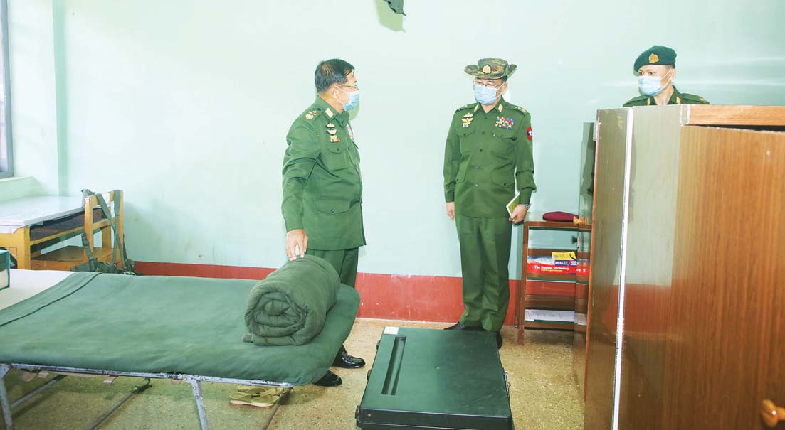 ထို့နောက် နိုင်ငံတော်စီမံအုပ်ချုပ်ရေးကောင်စီဥက္ကဋ္ဌ တပ်မတော်ကာကွယ်ရေး ဦးစီးချုပ်နှင့် အဖွဲ့ဝင်များသည် ဗိုလ်လောင်း အိပ်ဆောင်များ၊ စားရိပ်သာနှင့် စားချက်ဆောင်တို့အား လိုက်လံ ကြည့်ရှုစစ်ဆေးရာ ကျောင်းအုပ်ကြီးနှင့် တာဝန်ရှိသူများက လိုက်လံရှင်းလင်းပြသကြသည်။ ထိုသို့လိုက်လံကြည့်ရှုစစ်ဆေးစဉ် နိုင်ငံတော်စီမံအုပ်ချုပ်ရေးကောင်စီဥက္ကဋ္ဌ တပ်မတော် ကာကွယ်ရေးဦးစီးချုပ်က စစ်တက္ကသိုလ်သည် အနာဂတ် ခေါင်းဆောင်များကို မွေးထုတ်ပေးရာ ကျောင်းတော်ကြီးတစ်ခုဖြစ်သဖြင့် အရည်အချင်းပြည့်ဝပြီး ကိုယ်ရည်ကိုယ်သွေးမြင့်မားသည့် ဗိုလ်လောင်းများထွက်ပေါ်လာစေရန် စနစ်တကျ ကြပ်မတ်မွေးထုတ် ပေးရမည်ဖြစ်ကြောင်း၊ အခြေခံ နေထိုင်သွားလာ စားသောက်မှုပုံစံများမှအစပြု၍ အရာရှိတစ်ဦးနှင့်လျော်ညီစွာ နေထိုင်သွားလာ ပြုမူတတ်သည့် အလေ့အကျင့်ကောင်းများရရှိအောင် စနစ်တကျပြုစုပျိုးထောင် လေ့ကျင့် သင်ကြားပေးရမည်ဖြစ်ကြောင်း၊ ဗိုလ်လောင်းတစ်ဦးအနေဖြင့် ရသင့်ရထိုက်သည့် စစ်ဝတ်အသုံး အဆောင်ပစ္စည်းများကို သတ်မှတ်ကာလများအတိုင်း ထုတ်ပေး သွားရန်လိုပြီး မိမိတို့ နေထိုင်ရသည့်အိပ်ဆောင်တွင် စည်းကမ်းစနစ်တကျ နေထိုင်တတ်စေရန်နှင့် အသုံး အဆောင်ပစ္စည်းများကို စနစ်တကျဖြင့် အသုံးပြုတတ်စေရန် ကြပ်မတ်လေ့ကျင့်ပေးကြရမည် ဖြစ်ကြောင်း၊ စားရိပ်သာများအနေဖြင့် တစ်နေ့တာ ရသင့်ရထိုက်သည့် အချိုးအစားအတိုင်း စနစ်တကျတွက်ချက် ချက်ပြုတ်ကျွေးမွေးရန်နှင့် စားရိပ်သာများ၊ စားချက်ဆောင်များ သန့်ရှင်း သပ်ရပ်ပြီး ကျန်းမာရေးနှင့် ကိုက်ညီမှုရှိအောင် ကြပ်မတ်ဆောင်ရွက်ကြရန် လိုကြောင်းဖြင့် မှာကြားခဲ့ပြီး လိုအပ်သည်များ ပေါင်းစပ်ညှိနှိုင်း ဆောင်ရွက်ပေးသည်။