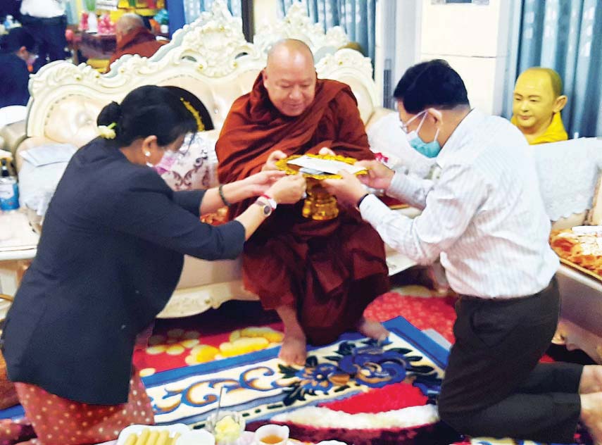 ဆက်လက်ပြီး နိုင်ငံတော်စီမံအုပ်ချုပ်ရေးကောင်စီဥက္ကဋ္ဌ၊ နိုင်ငံတော် ဝန်ကြီးချုပ်၊ ဇနီးနှင့် အဖွဲ့ဝင်များသည် လားရှိုးမြို့ရှိ သီရိမင်္ဂလာမန်ဆူရှမ်းကျောင်း တိုက်သို့သွားရောက်၍ လားရှိုးမြို့၊ နိုင်ငံတော်ဩဝါဒါစရိယ၊ မဟာဗောဓာရုံကျောင်းတိုက်ဆရာတော် မဟာဂန္ဓဝါစကပဏ္ဍိတ ဘဒ္ဒန္တ နာရဒ အား ဖူးမြော်ကြည်ညိုကာ ဆရာတော်ကြီး၏ ကျန်းမာရေးဆိုင်ရာများနှင့် ဘာသာရေး ဆိုင်ရာတို့ကို မေးမြန်းလျှောက်ထားခဲ့ပြီး လှူဖွယ်ပစ္စည်းများ ဆက်ကပ်လှူဒါန်းခဲ့ကြောင်း သတင်းရရှိသည်။