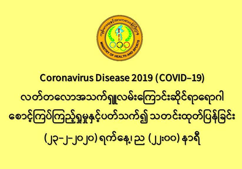 ကျန်းမာရေးနှင့်အားကစားဝန်ကြီးဌာနသည် တရုတ်ပြည်သူ့သမ္မတနိုင်ငံနှင့် ကမ္ဘာ့နိုင်ငံအချို့တွင် ကူးစက်ပျံ့နှံ့လျက်ရှိသည့် COVID-19 လတ်တလောအသက်ရှူလမ်းကြောင်းဆိုင်ရာ ရောဂါ ဖြစ်ပွားမှုဖြစ်စဉ်နှင့် ပတ်သက်၍ ရောဂါစောင့်ကြပ်ကြည့်ရှုခြင်း လုပ်ငန်းများအား အပြည်ပြည်ဆိုင်ရာ ဝင်ပေါက်၊ ထွက်ပေါက်ဂိတ်များတွင်လည်းကောင်း၊ ဆေးရုံအခြေပြုအဖြစ်လည်းကောင်း၊ ပြည်သူလူထုအခြေပြု စောင့်ကြပ်ကြည့်ရှုခြင်းလုပ်ငန်းများဖြင့်လည်းကောင်း၊ ပုဂ္ဂလိကဆေးရုံများနှင့် ပူးပေါင်း၍လည်းကောင်း ဆောင်ရွက်လျက်ရှိပါသည်။