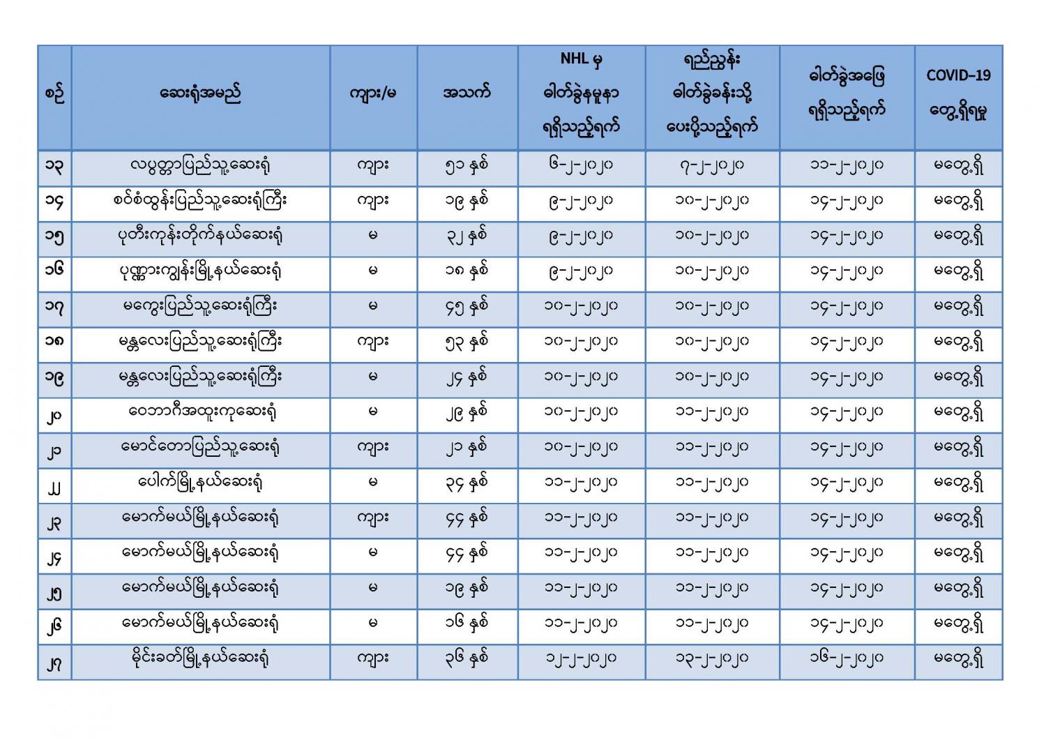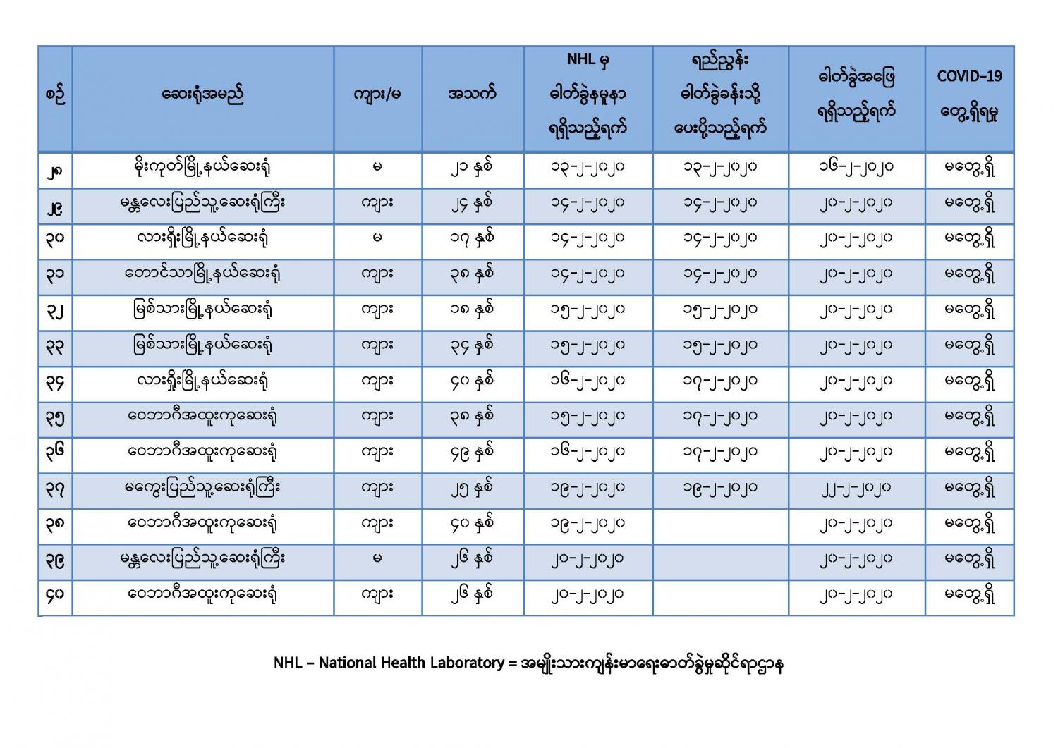 ကျန်းမာရေးနှင့်အားကစားဝန်ကြီးဌာနသည် COVID-19 ရောဂါစောင့်ကြပ်ကြည့်ရှုရေး လုပ်ငန်းများကို ဆောင်ရွက်လျက်ရှိရာ အောက်ပါဖြစ်စဉ်များဖြစ်ပွားမှုကို သတင်းရယူ၍ COVID-19 ရောဂါနှင့် သက်ဆိုင်မှု မရှိကြောင်း အတည်ပြုခြင်းအား ဆောင်ရွက်ခဲ့ပါသည်-