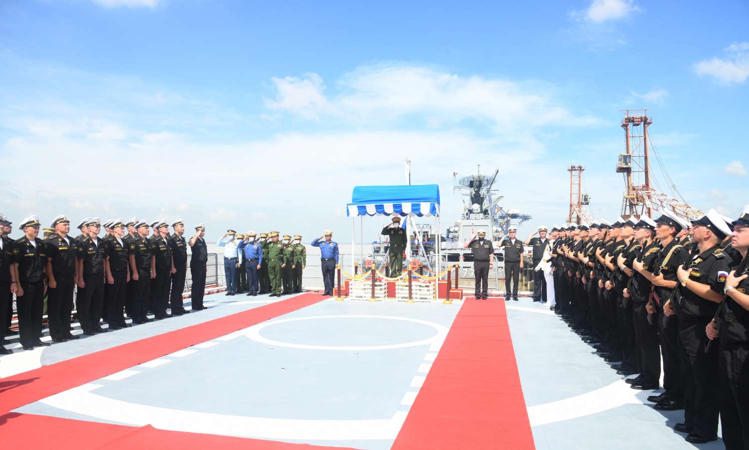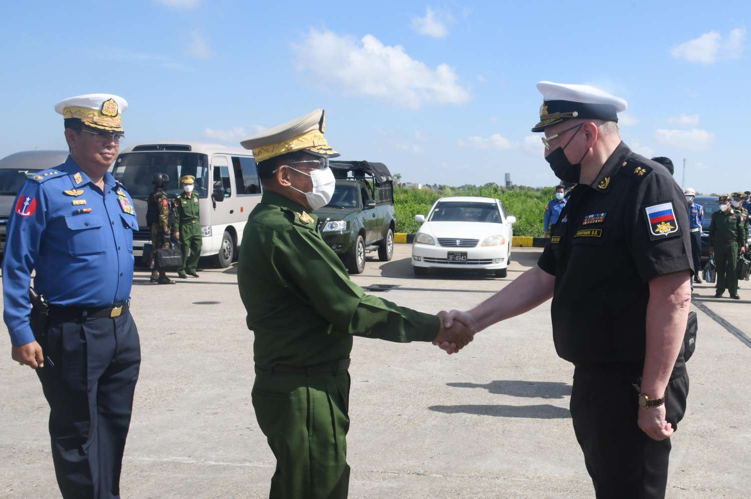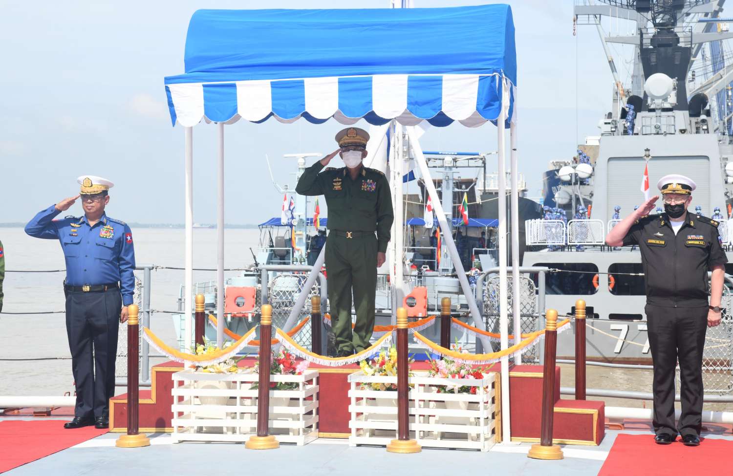 ဦးစွာ နိုင်ငံတော်စီမံအုပ်ချုပ်ရေးကောင်စီဥက္ကဋ္ဌ၊ တပ်မတော်ကာကွယ်ရေး ဦးစီးချုပ်သည် ကာကွယ်ရေးဦးစီးချုပ်(ရေ) ဗိုလ်ချုပ်ကြီး မိုးအောင်၊ ကာကွယ်ရေး ဦးစီးချုပ်(လေ) ဗိုလ်ချုပ်ကြီး မောင်မောင်ကျော်၊ ကာကွယ်ရေးဦးစီးချုပ်ရုံးမှ တပ်မတော်အရာရှိကြီးများ၊ ရန်ကုန်တိုင်း စစ်ဌာနချုပ် တိုင်းမှူးနှင့် တာဝန်ရှိသူများ လိုက်ပါ၍ ရန်ကုန်မြို့၊ သီလဝါဆိပ်ကမ်း MITT တံတားသို့ ရောက်ရှိကြရာ ရုရှားဖက်ဒရေးရှင်းနိုင်ငံ၊ ဒုတိယရေတပ်ဦးစီးချုပ် Vice Admiral Vladimir Lvovich kasatonov နှင့် စစ်ရေယာဉ်မှူး Captain Andrey Kuznetsov တို့က ကြိုဆို နှုတ်ဆက်ကြသည်။ ထို့နောက် နိုင်ငံတော်စီမံအုပ်ချုပ်ရေးကောင်စီ ဥက္ကဋ္ဌ၊ တပ်မတော်ကာကွယ် ရေးဦးစီးချူပ်သည် ရုရှားစစ်ရေယာဉ် Gremyashiy ပေါ်၌ ရုရှားစစ်ရေယာဉ် ဂုဏ်ပြုတပ်ဖွဲ့က နှစ်နိုင်ငံ နိုင်ငံတော်တေးသီချင်းဖြင့် ဂုဏ်ပြုကြိုဆိုအလေးပြုခြင်းကို ခံယူသည်။