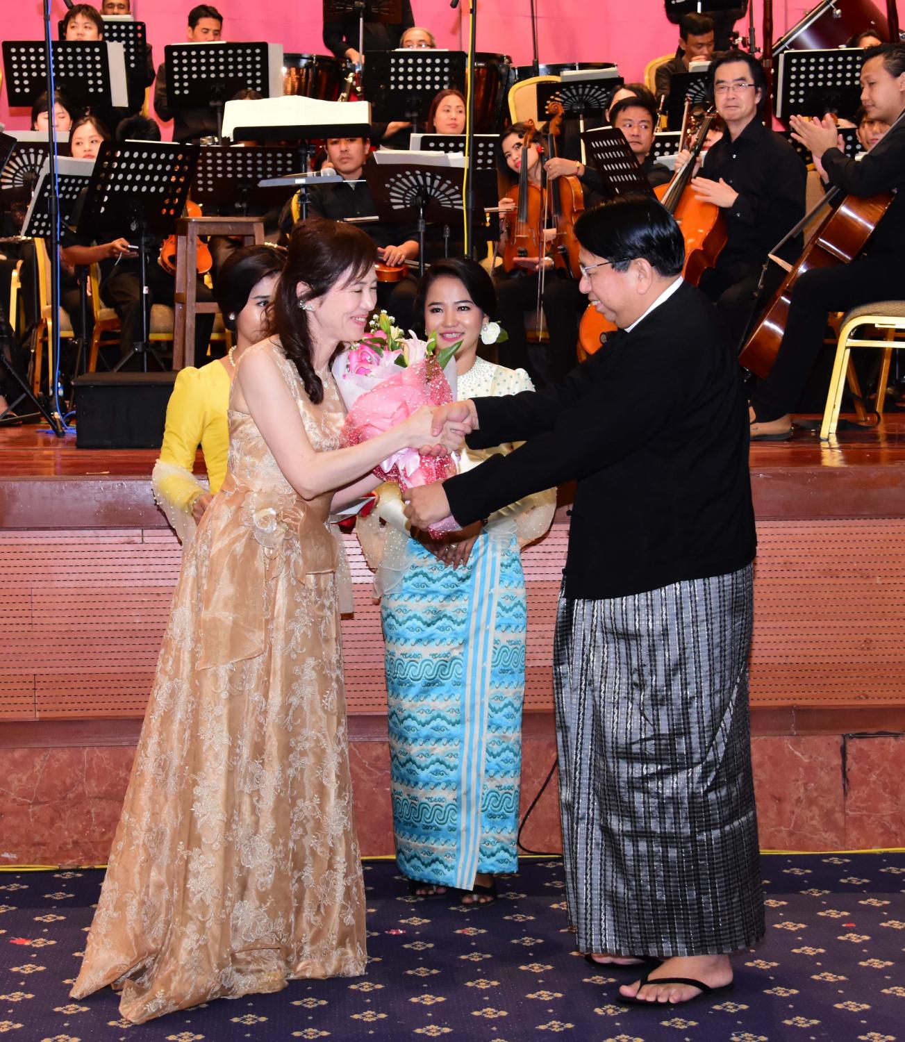 ထို့နောက် စီမံကိန်း၊ ဘဏ္ဍာရေးနှင့်စက်မှုဝန်ကြီးဌာန ပြည်ထောင်စုဝန်ကြီး ဦးစိုးဝင်းက ဂျပန်ဂီတပညာရှင်များအဖွဲ့ကို လည်းကောင်း၊ အပြည်ပြည်ဆိုင်ရာပူးပေါင်း ဆောင်ရွက်ရေး ဝန်ကြီးဌာန ပြည်ထောင်စုဝန်ကြီး ဦးကျော်တင်က နိုင်ငံတော်သံစုံ တီးဝိုင်းအဖွဲ့ကိုလည်းကောင်း ဂုဏ်ပြုပန်းစည်းနှင့် ပန်းခြင်းများ ပေးအပ်သည်။
