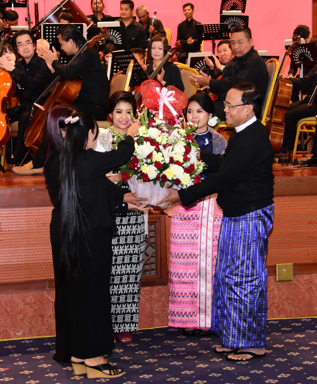 ဖျော်ဖြေတင်ဆက်မှုအပြီးတွင် အမျိုးသားလွှတ်တော်ဥက္ကဋ္ဌ မန်းဝင်းခိုင်သန်းက ဂျပန်နိုင်ငံမှ ဂီတစာဆို တီးဝိုင်းခေါင်းဆောင် Mr. Yunosuke Yamamoto ကို ဂုဏ်ပြု ပန်းစည်းပေးအပ် သည်။