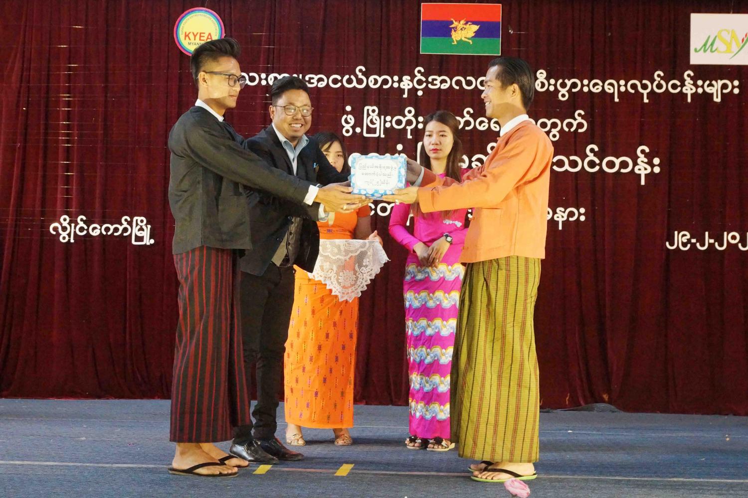 ဆက်လက်၍ ကယားလူငယ်စွန့်ဦးတီထွင် လုပ်ငန်းရှင်များအသင်းမှ တာဝန်ရှိသူတစ်ဦးက သင်တန်းကျင်းပရသည့် ရည်ရွယ်ချက်အား ရှင်းလင်းတင်ပြသည်။ ထို့နောက် ကယားပြည်နယ်အစိုးရအဖွဲ့ ပြည်နယ်ဝန်ကြီးချုပ် ဦးအယ်လ်ဖောင်းရှို က စီးပွားရေးဆိုင်ရာ ဖွံ့ဖြိုးမှုသင်တန်းအတွက် ထောက်ပံ့ငွေကျပ် (၂၅) သိန်းကို ပေးအပ်ခဲ့ရာ ကယားလူငယ် စွန့်ဦးတီထွင်လုပ်ငန်းရှင်များအသင်းမှ တာဝန်ရှိသူတစ်ဦး က လက်ခံရယူခဲ့သည်။