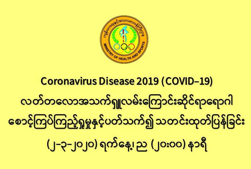 (က) ရန်ကုန်တိုင်းဒေသကြီး၊ လှိုင်သာယာမြို့နယ်ရှိ စက်ရုံတစ်ရုံတွင် အလုပ်လုပ်ကိုင် လျက်ရှိသော အသက် (၂၉) နှစ်အရွယ် တရုတ်ပြည်သူ့သမ္မတနိုင်ငံသား အမျိုးသားတစ်ဉီးသည် (၁၈-၂-၂၀၂၀) ရက်နေ့တွင် တရုတ်ပြည်သူ့သမ္မတနိုင်ငံ၊ တိုင်ပေရှိ ၎င်း၏နေအိမ်သို့သွားရောက်ခဲ့ပြီး (၂၅-၂-၂၀၂၀) ရက်နေ့တွင် မြန်မာနိုင်ငံသို့ ပြန်လည်ရောက်ရှိခဲ့ပါသည်။ အဆိုပါ အမျိုးသား သည် (၂၈-၂-၂၀၂၀) ရက်နေ့မှစ၍ ဖျားခြင်း၊ လည်ချောင်းနာခြင်း၊ ချောင်းဆိုးခြင်း၊ အသက်ရှူကြပ်ခြင်းစသည့် လက္ခဏာများ ခံစားခဲ့ရသဖြင့် (၁-၃-၂၀၂၀) ရက်နေ့၊ နေ့လယ်ပိုင်းတွင် ပန်းလှိုင်ဆေးရုံသို့ သွားရောက်ပြသခဲ့ရာ ဝေဘာဂီအထူးကုဆေးရုံသို့ ညွှန်းပို့ခဲ့ပါသည်။ အဆိုပါ လူနာအား စောင့်ကြည့်လူနာအဖြစ်သတ်မှတ်၍ သီးခြားထားရှိ ကုသမှုပေးလျက်ရှိပြီး ဓါတ်ခွဲနမူနာရယူ စစ်ဆေးလျက်ရှိပါသည်။