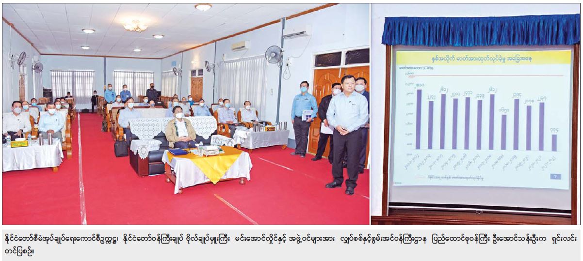 ဦးစွာ စီမံကိန်းရှင်းလင်းဆောင်၌ လျှပ်စစ်နှင့် စွမ်းအင်ဝန်ကြီးဌာန ပြည်ထောင်စုဝန်ကြီး ဦးအောင်သန်းဦးက ဓာတ်အားပေးစက်ရုံဆိုင်ရာ အကျဉ်းချုပ် အချက်အလက်များ၊ နှစ်အလိုက် ရဲရွာတမံရေသိုလှောင်မှုအခြေအနေ၊ နှစ်အလိုက် ဓာတ်အားထုတ်လုပ်နိုင်မှု အခြေအနေ၊ ရဲရွာရေလှောင်တမံ နှစ်အလိုက် ရေဝင်ရောက်မှုအခြေအနေ၊ ရေလှောင်တမံ ရေအမြင့် အလိုက် စက်တစ်လုံးထုတ်လုပ်နိုင်မှု စွမ်းအား၊ ဝန်ထမ်း အင်အားနှင့် ဝန်ထမ်းအိမ်ရာများ ပြုပြင် ဆောင်ရွက်နေမှု အခြေအနေ၊ ဓာတ်အားထုတ်လုပ်မှု ကုန်ကျစရိတ်၊ ၂၀၁၉-၂၀၂၀ ဘဏ္ဍာရေးနှစ် အတွင်း စက်အမှတ်(၄)အကြီးစား ပြုပြင်ခြင်း ဆောင်ရွက်ခဲ့မှု အခြေအနေ၊ မြစ်ငယ်မြစ်ပေါ်ရှိ ရေအားလျှပ်စစ် အရင်းအမြစ်များ၏ လျှပ်စစ်စီမံကိန်းများ၏ အခြေအနေ၊ နမ္မတူ (သီပေါ) ရေအားလျှပ်စစ်စီမံကိန်းဆိုင်ရာ အချက်အလက်များနှင့် လုပ်ငန်း ဆောင်ရွက်မှု အခြေအနေ၊ အထက်ရဲရွာ စီမံကိန်းဆိုင်ရာ အချက်အလက်များနှင့် လုပ်ငန်းဆောင်ရွက်နေမှု အခြေအနေ၊ အလယ်ရဲရွာ ရေအားလျှပ်စစ် စီမံကိန်းဆိုင်ရာ အချက်အလက်များနှင့် လုပ်ငန်းဆောင်ရွက်နေမှု အခြေအနေ၊ ဒီးဒုတ်ရေအားလျှပ်စစ်စီမံကိန်းဆိုင်ရာ အချက်အလက်များနှင့် လုပ်ငန်းဆောင်ရွက်နေမှု အခြေအနေ၊ ၂၀၂ ခုနှစ်အတွင်း ရေအားနှင့် နေရောင်ခြည်စွမ်းအင်သုံး လျှပ်စစ် ဓာတ်အားပေးစက်ရုံများ၊ အပူ စွမ်းအင်သုံး ဓာတ်အားပေးစက်ရုံများမှ လျှပ်စစ်ဓာတ်အားများ ထုတ်လုပ်နေမှုအခြေအနေနှင့် နှစ်အလိုက် ဓာတ်အားတိုးတက်သုံးစွဲမှု အခြေ အနေ၊ ဓာတ်အား လိုအပ်ချက်၊ ထုတ်လုပ်နိုင်မှုနှင့် ဝန်အားလျှော့ချရမည့် အခြေအနေ၊ ဓာတ်အားလိုင်းများ ဖျက်ဆီးခံရမှုနှင့် ပြန်လည် ပြုပြင် နေမှု အခြေအနေ၊ သဘာဝဓာတ်ငွေ့ဖြင့် လက်ရှိ ဓာတ်အား ထုတ်လုပ် နေမှုအခြေအနေများနှင့် ပတ်သက်၍ ရှင်းလင်းတင်ပြသည်။
