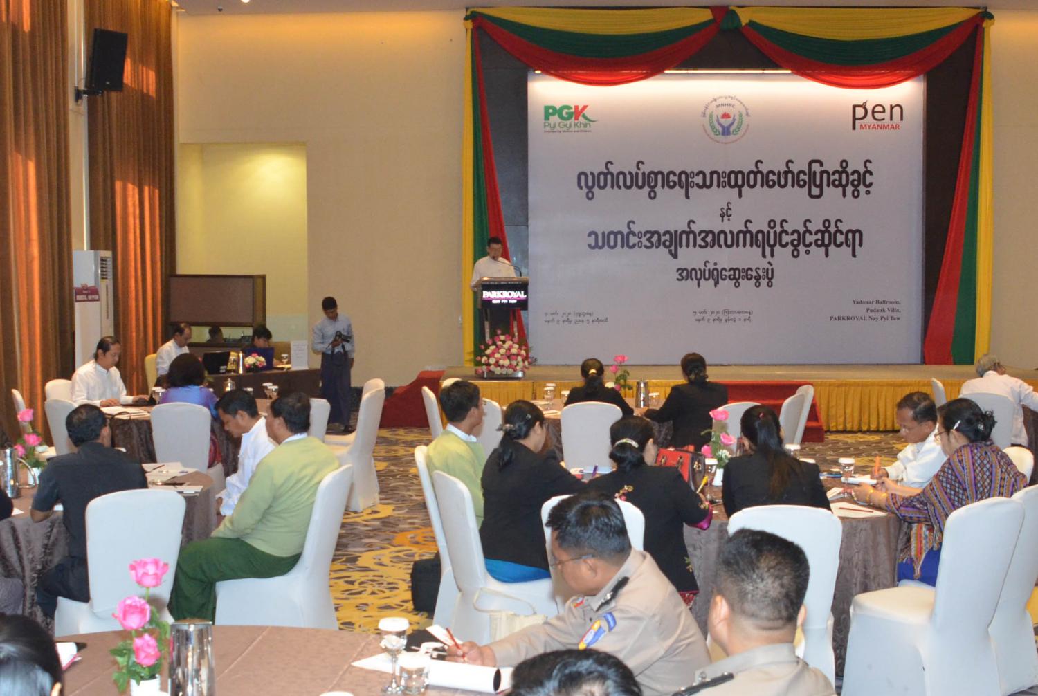 မြန်မာနိုင်ငံ အမျိုးသားလူ့အခွင့်အရေးကော်မရှင်၊ Pen Myanmar အဖွဲ့နှင့် ပြည်ကြီးခင်အဖွဲ့တို့ ပူးပေါင်းကျင်းပသည့် လွတ်လပ်စွာရေးသားထုတ်ဖော် ပြောဆိုခွင့်နှင့် သတင်းအချက်အလက် ရပိုင်ခွင့်ဆိုင်ရာ အလုပ်ရုံဆွေးနွေးပွဲကို ယနေ့နံနက် ၉ နာရီတွင် နေပြည်တော်ရှိ Park Royal ဟိုတယ်၌ ကျင်းပသည်။