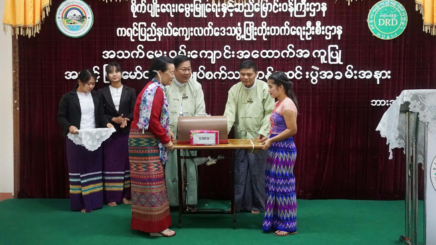 ရှေးဦးစွာ ကရင်ပြည်နယ်အစိုးရအဖွဲ့၊ ပြည်နယ်ဝန်ကြီးချုပ်ဒေါ်နန်းခင်ထွေးမြင့်က သင်တန်းဆင်းအမှာစကားပြောကြားပြီး သင်တန်းဆင်းထူးချွန်ဆုရရှိသော ကြာအင်းဆိပ်ကြီးမြို့နယ်၊ ဖါးပြကျေးရွာမှ နော်ဖေါဘူးဘူးနှင့် ဘားအံမြို့နယ် အီဟယ်လေး ကျေးရွာမှ မချစ်ချစ်တို့အား အပ်ချုပ်စက်တစ်စုံစီနှင့် ဂုဏ်ပြုဆုများပေးအပ်ချီးမြှင့်ကာ ပြည်နယ်စိုက်ပျိုးရေး၊ မွေးမြူရေးနှင့်ဆည်မြောင်းဝန်ကြီး ဦးစောမြင့်ဦးက သင်တန်းဆင်းအောင်လက်မှတ်များ ပေးအပ်ချီးမြှင့်သည်။