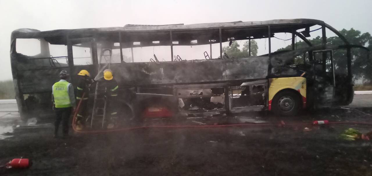 အဆိုပါဖြစ်စဉ်ကြောင့် Express ယာဉ်တစ်စီးလုံး မီးလောင်ကျွမ်းသွားခဲ့ပြီး ယာဉ်ပေါ်ပါ ယာဉ်မောင်း/ ယာဉ်နောက်လိုက် အပါအဝင် ခရီးသည်ကျား(၁၂) ဦးမ(၂၀) ဦးပေါင်း (၃၂) ဦးတို့တွင် ထိခိုက် ဒဏ်ရာ ရရှိမှုမရှိခဲ့ကြောင်းနှင့် မီးငြိမ်းသတ်နိုင်ရေးအတွက်အမြန်လမ်းမကြီးရဲတပ်ဖွဲ့ ဘောနတ်ကြီးစခန်းမှ တပ်ဖွဲ့ဝင် များနှင့် အထောက်အကူပြု အဖွဲ့ များ ကူညီဆောင်ရွက်လျက် ရှိကြောင်း သိရသည်။