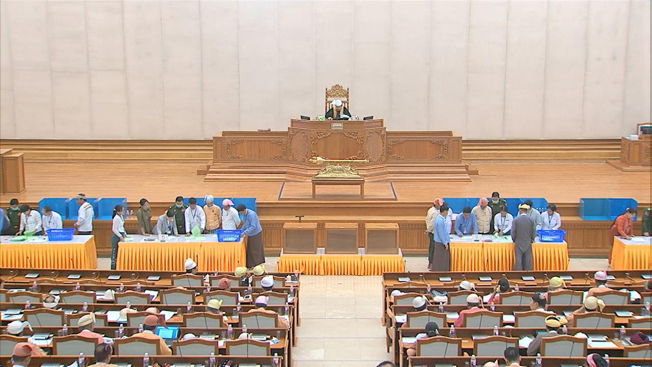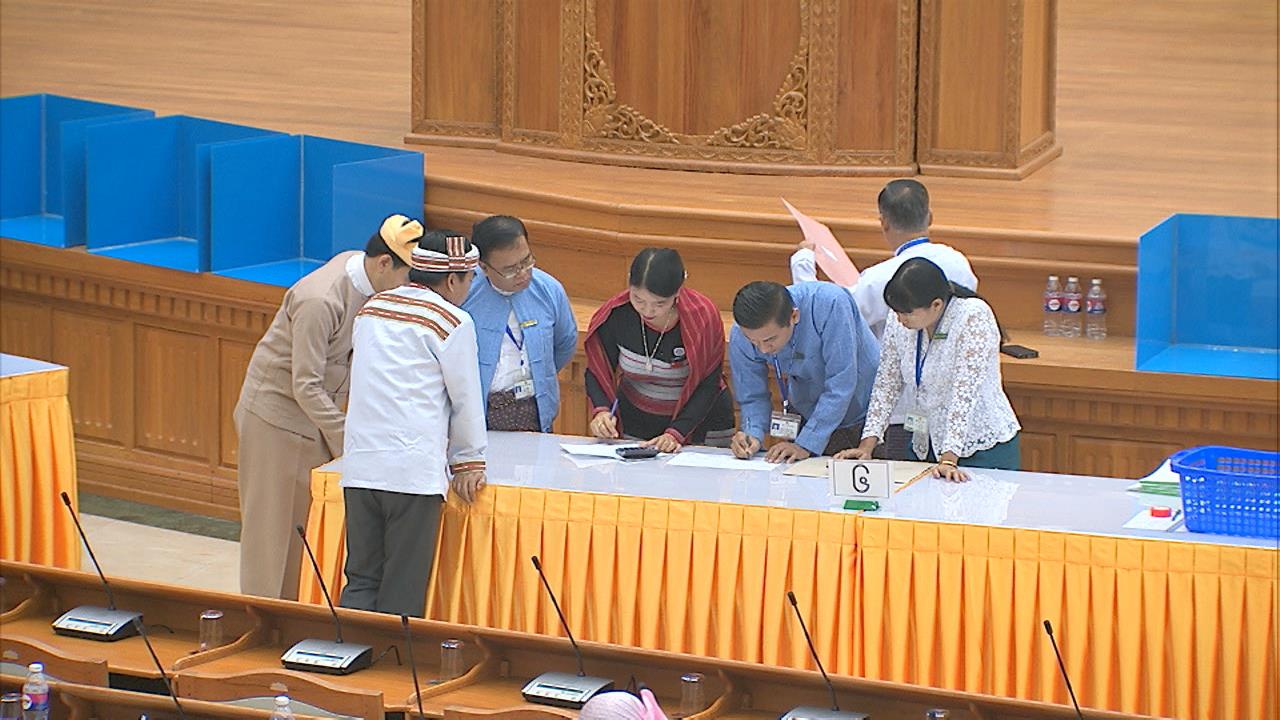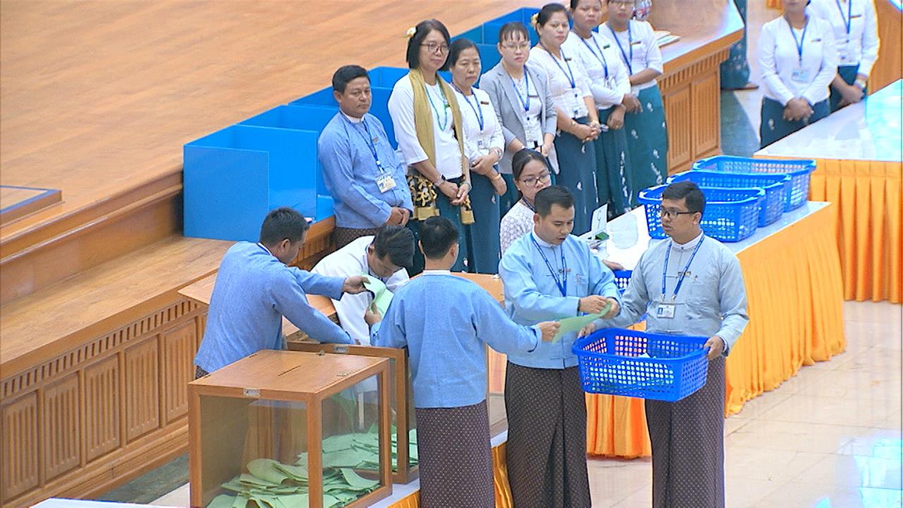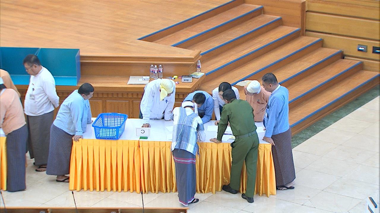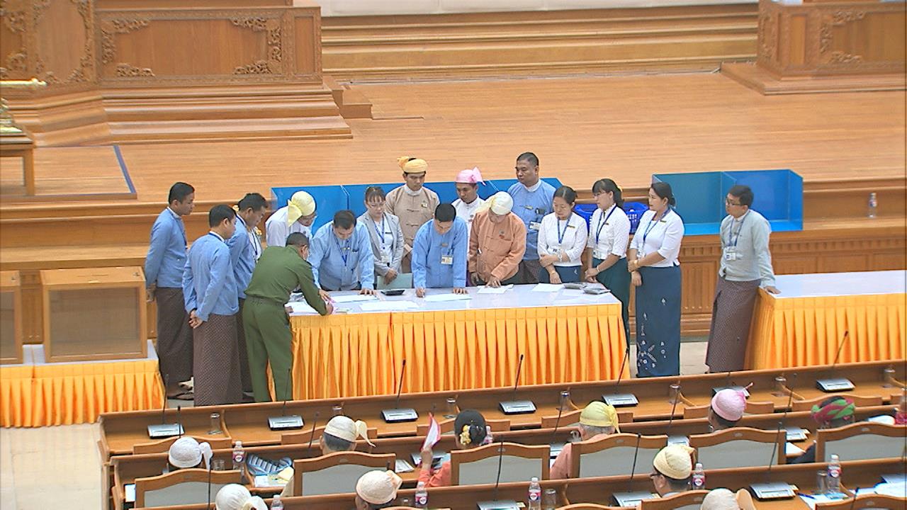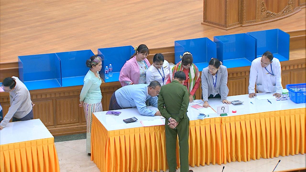 ရှေးဦးစွာ ပြည်ထောင်စုလွှတ်တော်ရုံး ညွှန်ကြားရေးမှူးချုပ် ဦးကျော်စိုးက အတည်ပြုမည့် ဆန္ဒမဲလက်မှတ်များကို ရေတွက် အပ်နှံသည်။