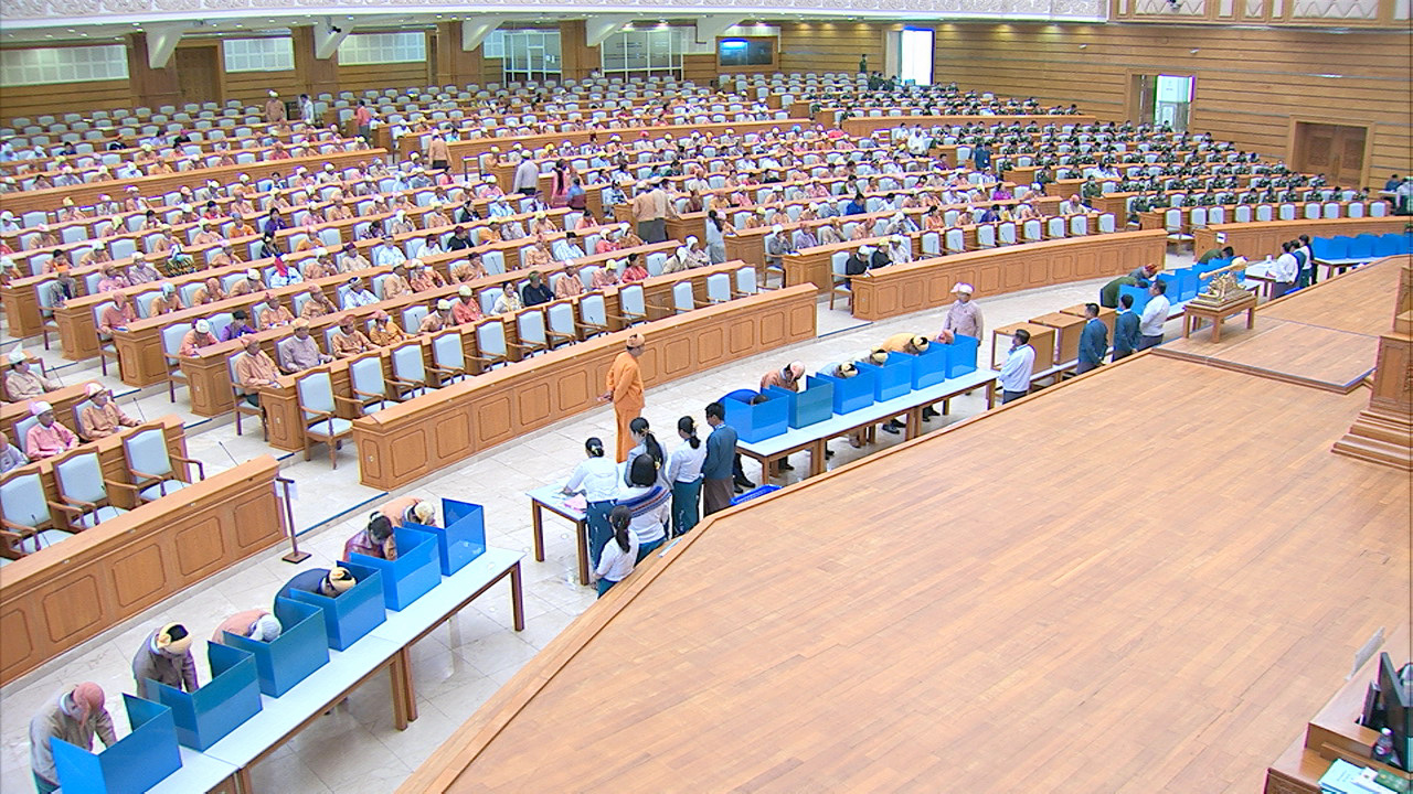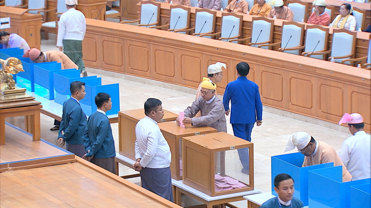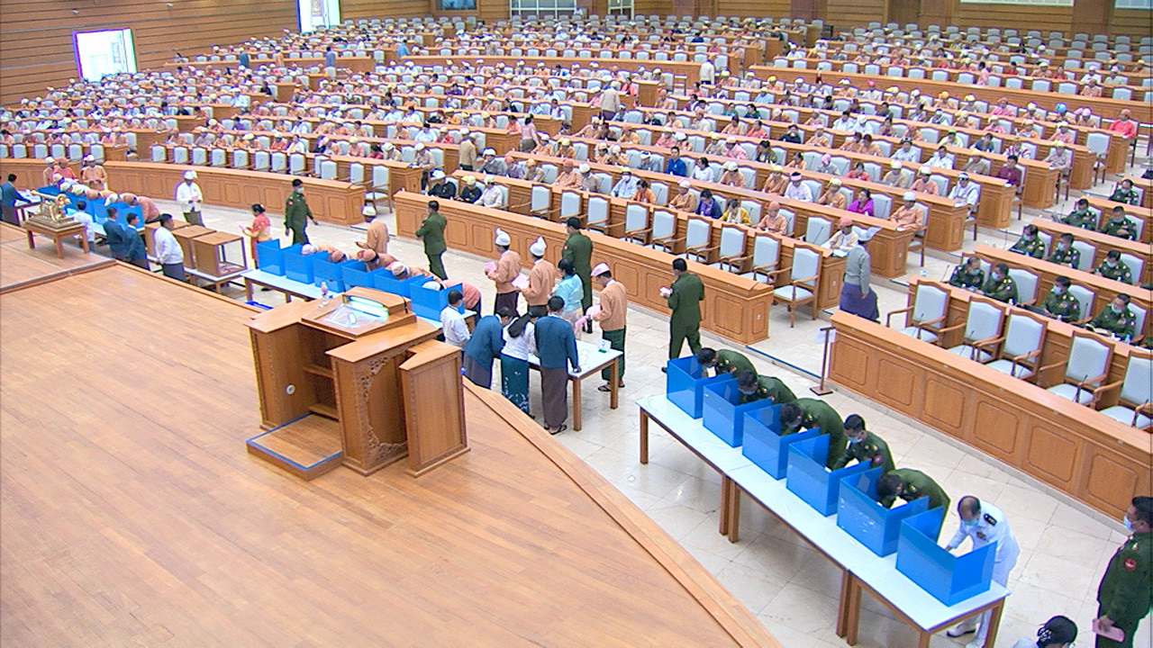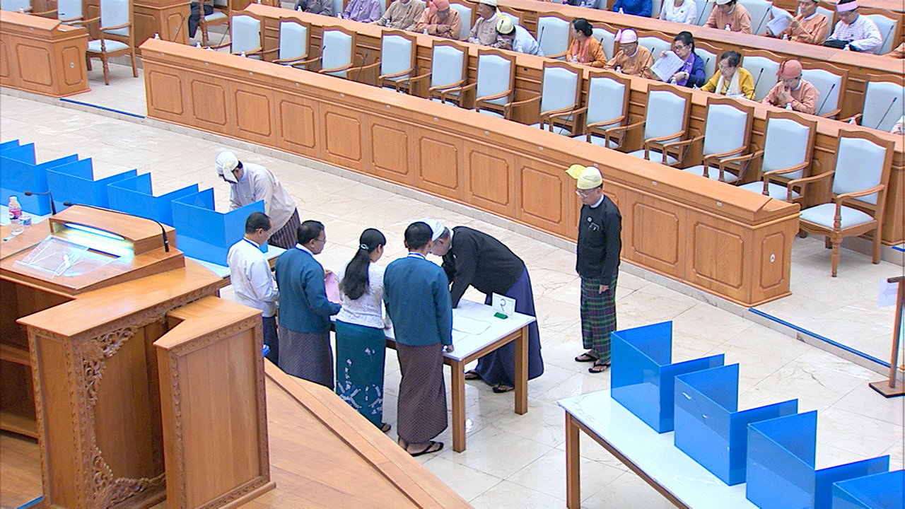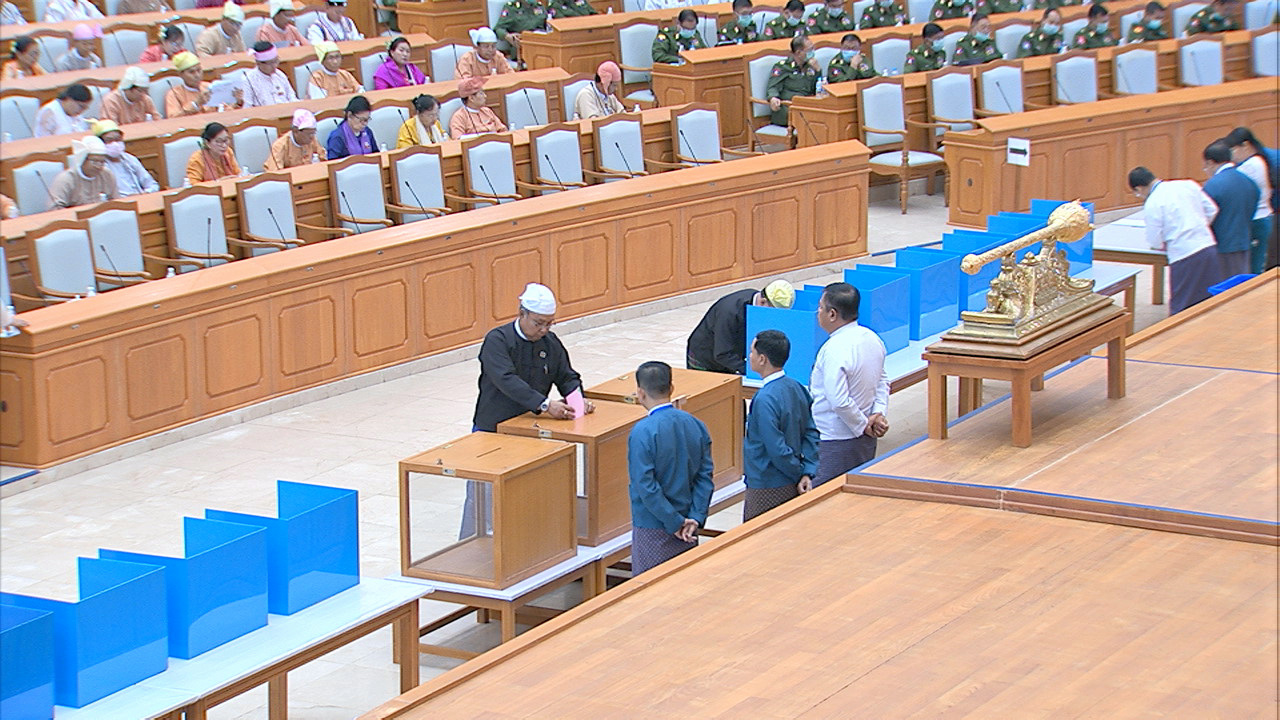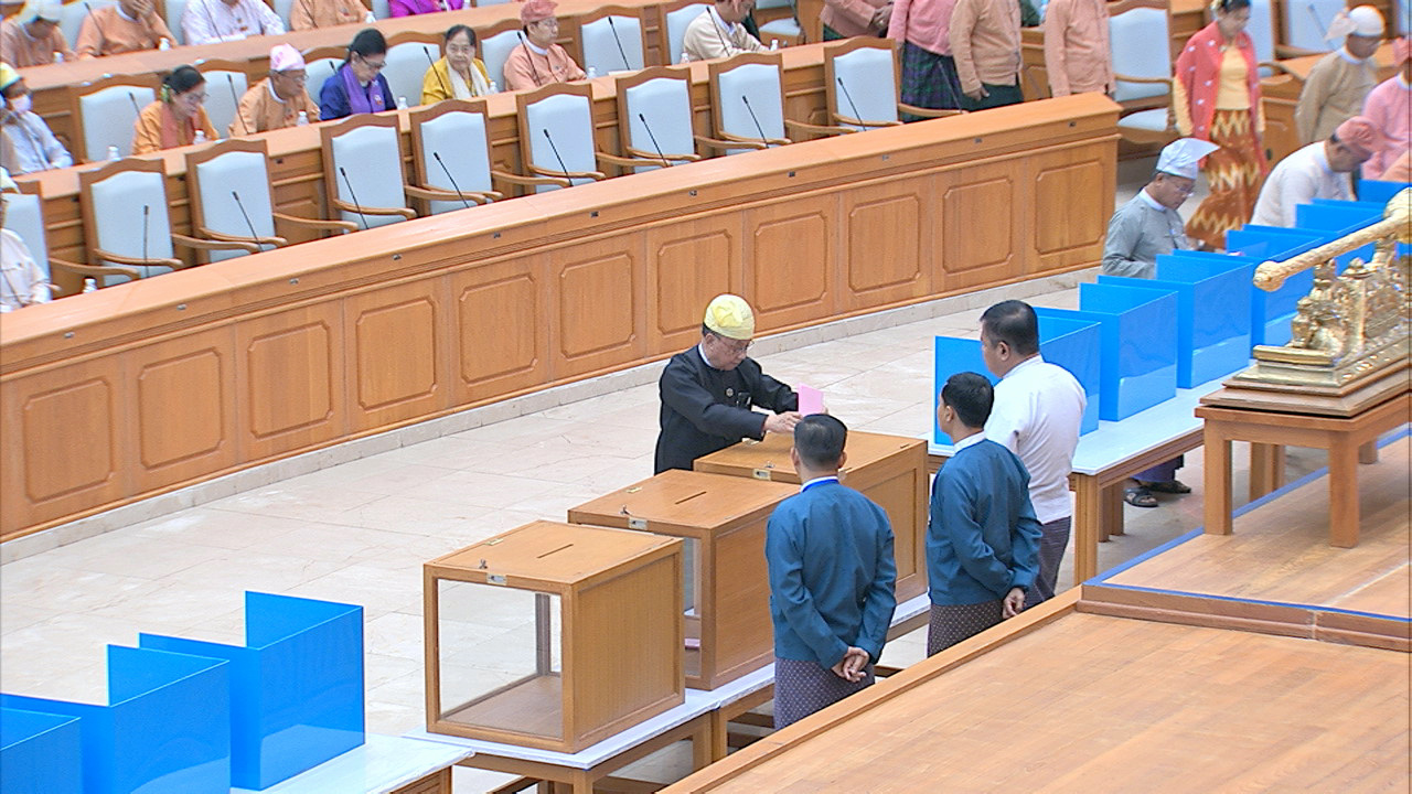 ယင်းနောက် အမျိုးသားလွှတ်တော်ဥက္ကဋ္ဌ မန်းဝင်းခိုင်သန်း၊ ပြည်ထောင်စုလွှတ်တော် ဒုတိယနာယက ဦးထွန်းအောင် (ခ) ဦးထွန်းထွန်းဟိန်၊ အမျိုးသားလွှတ်တော် ဒုတိယဥက္ကဋ္ဌ ဦးအေးသာအောင်နှင့် ပြည်ထောင်စုလွှတ်တော် ကိုယ်စားလှယ်များက သတ်မှတ်နေရာတွင် လျှို့ဝှက်ဆန္ဒပြုခြင်း နည်းလမ်းဖြင့် ဆန္ဒမဲပေးကြသည်။