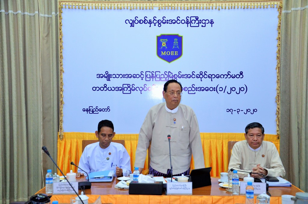 ထို့နောက် ရေအားလျှပ်စစ် အကောင်အထည်ဖော်ရေးဦးစီးဌာန ညွှန်ကြားရေးမှူးချုပ် ဦးဟိန်းထက်က (၂/၂၀၁၉) အစည်းအဝေးဆုံးဖြတ်ချက်အရ လုပ်ငန်းကော်မတီများ ဖွဲ့စည်းနိုင်ရေးနှင့် ဆောင်ရွက်လျက် ရှိသော ပြန်ပြည့်မြဲစွမ်းအင်ကိစ္စရပ်များနှင့် အဆိုပြုတင်ပြလာမှုများ၊ လျှပ်စစ်စွမ်းအား စီမံရေးဦးစီးဌာန ညွှန်ကြားရေးမှူးချုပ် ဒေါ်မိမိခိုင်က နိုင်ငံတကာ အဖွဲ့အစည်းများနှင့် ပူးပေါင်းဆောင်ရွက်မှု၊ နေစွမ်းအင် စီမံကိန်းနှင့် လေစွမ်းအင်စီမံကိန်းများ အကောင်အထည်ဖော် ဆောင်ရွက်နိုင်ရေးကိစ္စများကို ရှင်းလင်းတင်ပြ ကြသည်။