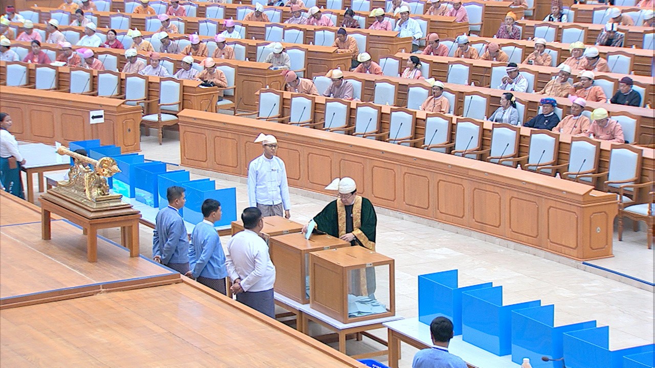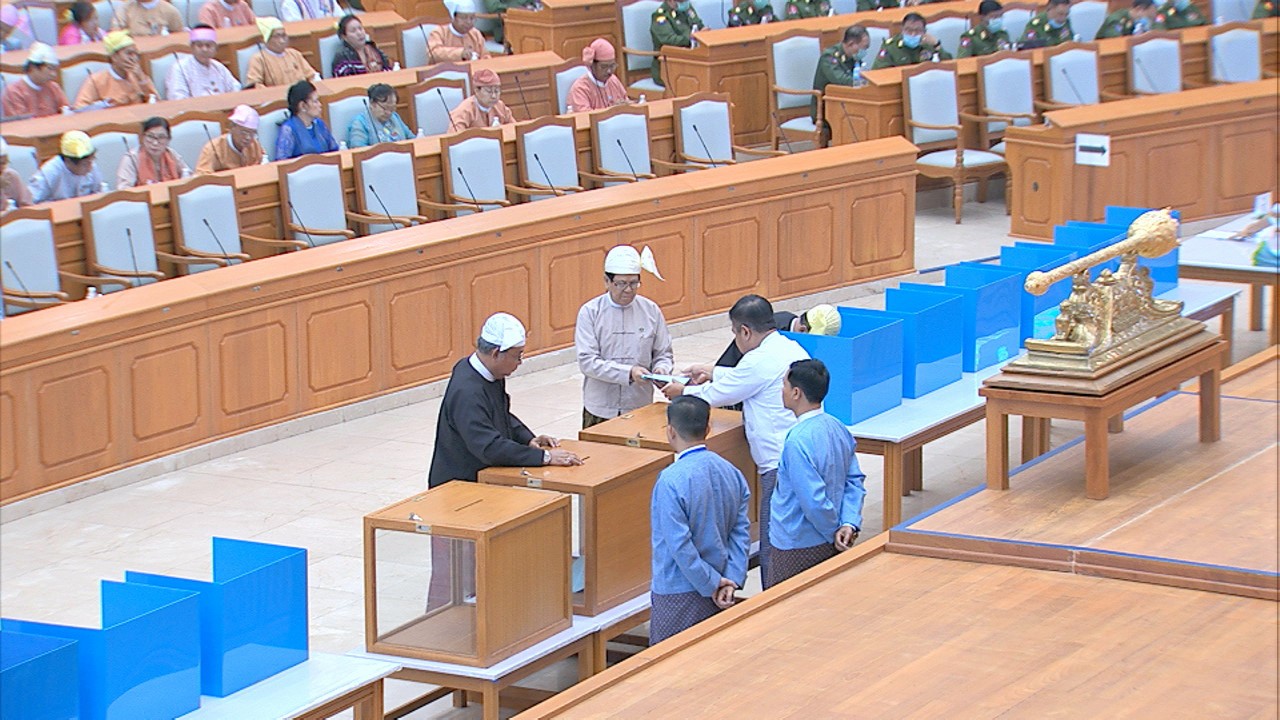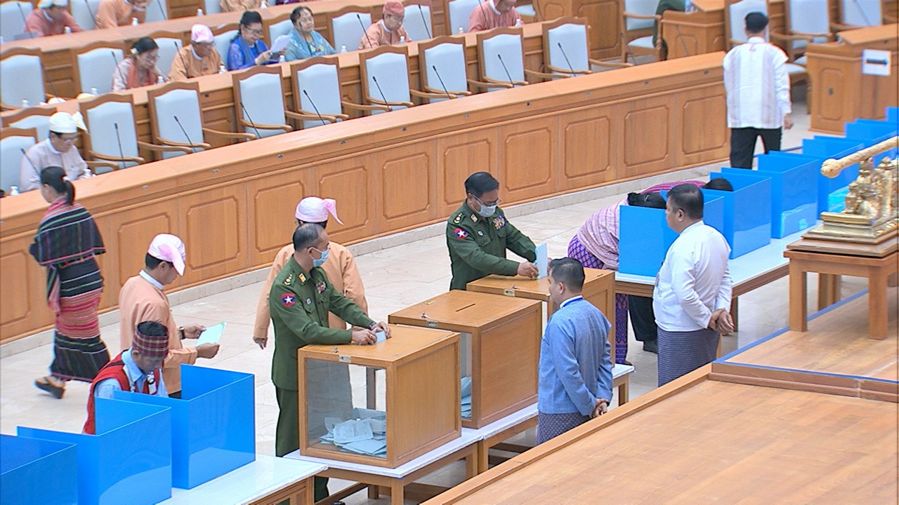 ယင်းနောက် အမျိုးသားလွှတ်တော် ဥက္ကဋ္ဌ မန်းဝင်းခိုင်သန်း၊ ပြည်ထောင်စုလွှတ်တော် ဒုတိယနာယက ဦးထွန်းအောင် (ခ) ဦးထွန်းထွန်းဟိန်၊ အမျိုးသားလွှတ်တော် ဒုတိယ ဥက္ကဋ္ဌ ဦးအေးသာအောင်နှင့် ပြည်ထောင်စုလွှတ်တော် ကိုယ်စားလှယ်များက သတ်မှတ် နေရာတွင် လျှို့ဝှက်ဆန္ဒပြုခြင်း နည်းလမ်းဖြင့် ဆန္ဒမဲပေးကြသည်။