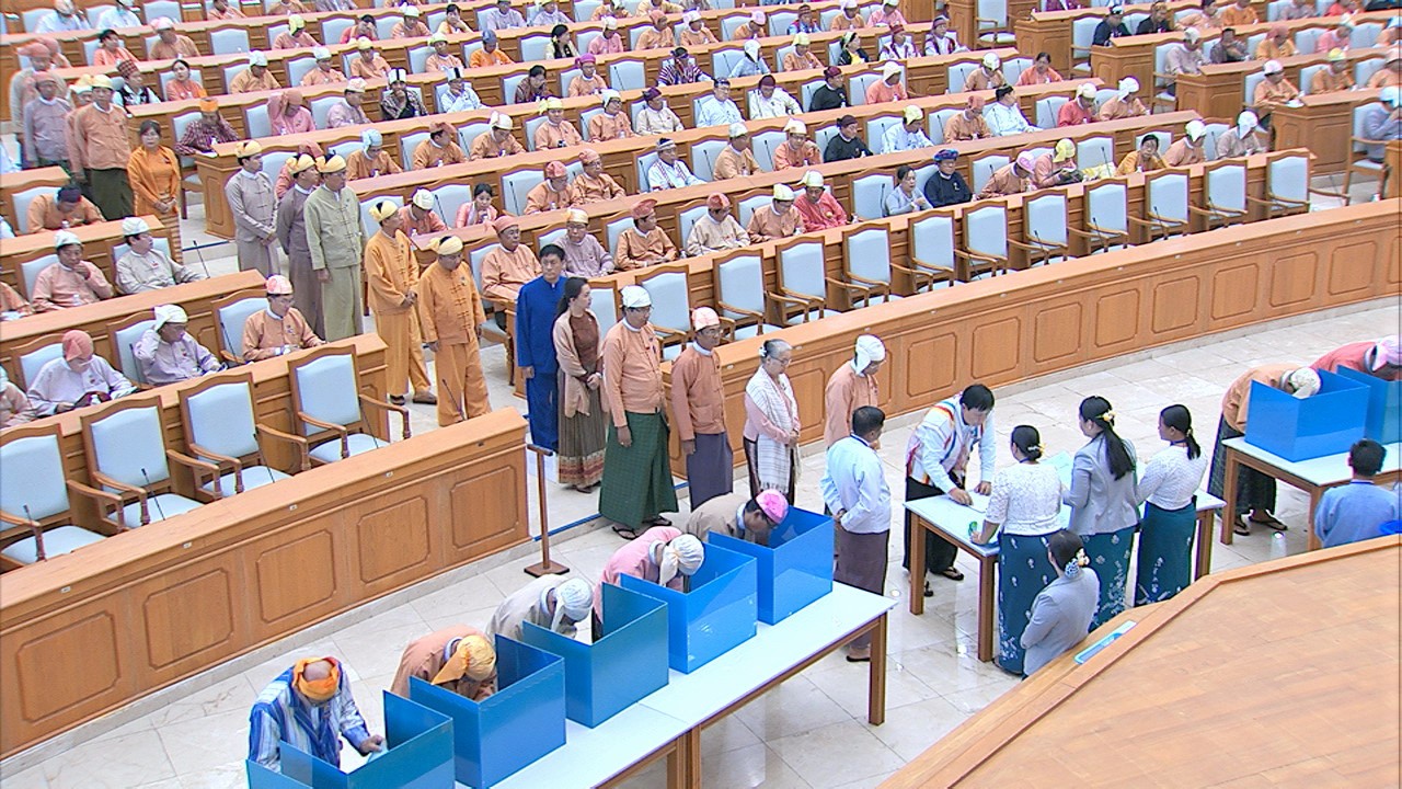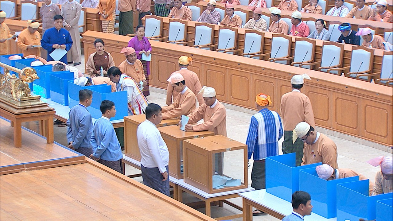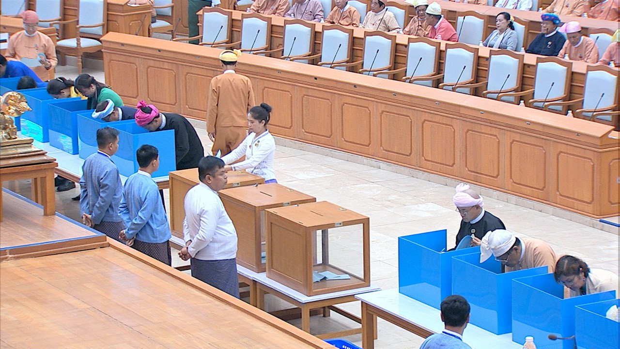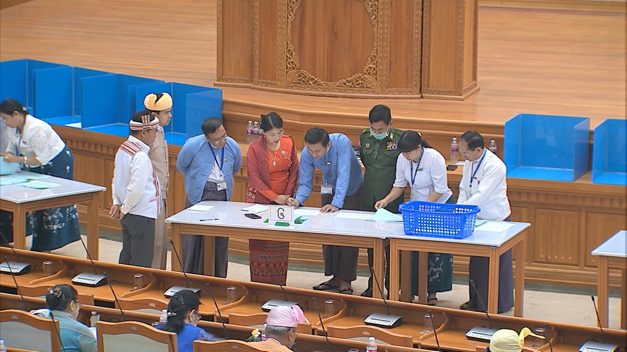 ယင်းနောက် အမျိုးသားလွှတ်တော် ဥက္ကဋ္ဌ မန်းဝင်းခိုင်သန်း၊ ပြည်ထောင်စုလွှတ်တော် ဒုတိယနာယက ဦးထွန်းအောင် (ခ) ဦးထွန်းထွန်းဟိန်၊ အမျိုးသားလွှတ်တော် ဒုတိယ ဥက္ကဋ္ဌ ဦးအေးသာအောင်နှင့် ပြည်ထောင်စုလွှတ်တော် ကိုယ်စားလှယ်များက သတ်မှတ် နေရာတွင် လျှို့ဝှက်ဆန္ဒပြုခြင်း နည်းလမ်းဖြင့် ဆန္ဒမဲပေးကြသည်။