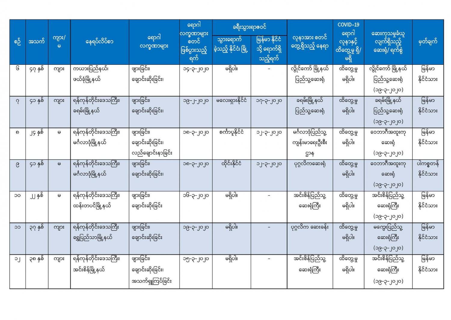 ၃။ ရှမ်းပြည်နယ် (တောင်ပိုင်း)၊ ကျေးသီးမြို့နယ်တွင် နေထိုင်သော အသက် (၄၁)နှစ် အရွယ် အမျိုးသမီး (၁) ဦးသည် (၅-၃-၂၀၂၀)ရက်နေ့မှစ၍ ချောင်းဆိုးခြင်း၊ မောပန်းခြင်းစသည့် ရောဂါ လက္ခဏာများခံစားခဲ့ရသဖြင့် မိုင်းနောင်တိုက်နယ် ပြည်သူ့ ဆေးရုံတွင် (၁၉-၃-၂၀၂၀) ရက်နေ့၌ လာရောက်ပြသခဲ့ရာ လူနာမှာ လွန်ခဲ့သော (၂)ပတ်အတွင်း ထိုင်းနိုင်ငံသို့ ခရီးသွား ရာဇဝင်ရှိခဲ့သဖြင့် စောင့်ကြည့်လူနာအဖြစ် သတ်မှတ်၍ ဓာတ်ခွဲနမူနာရယူ၍ အမျိုးသားကျန်းမာရေးဓာတ်ခွဲမှုဆိုင်ရာ ဌာန (ရန်ကုန်)သို့ ပေးပို့စစ်ဆေးရန် စီစဉ်လျက်ရှိပြီး လိုအပ်သော ဆေးကုသမှုများပေးနေစဉ် (၂၀-၃-၂၀၂၀) ရက်နေ့တွင် သေဆုံး သွားခဲ့ကြောင်းသိရှိရပါသည်။ သေဆုံးရသော အကြောင်းအရင်းမှာ ပြင်းထန် အဆုတ်ရောင်ရောဂါနှင့် နာတာရှည်ရောဂါ အခံဖြစ်သော ဆီးချိုရောဂါ၏ နောက်ဆက်တွဲ ဆိုးကျိုး များကြောင့် သေဆုံးရခြင်းဖြစ်ပါသည်။