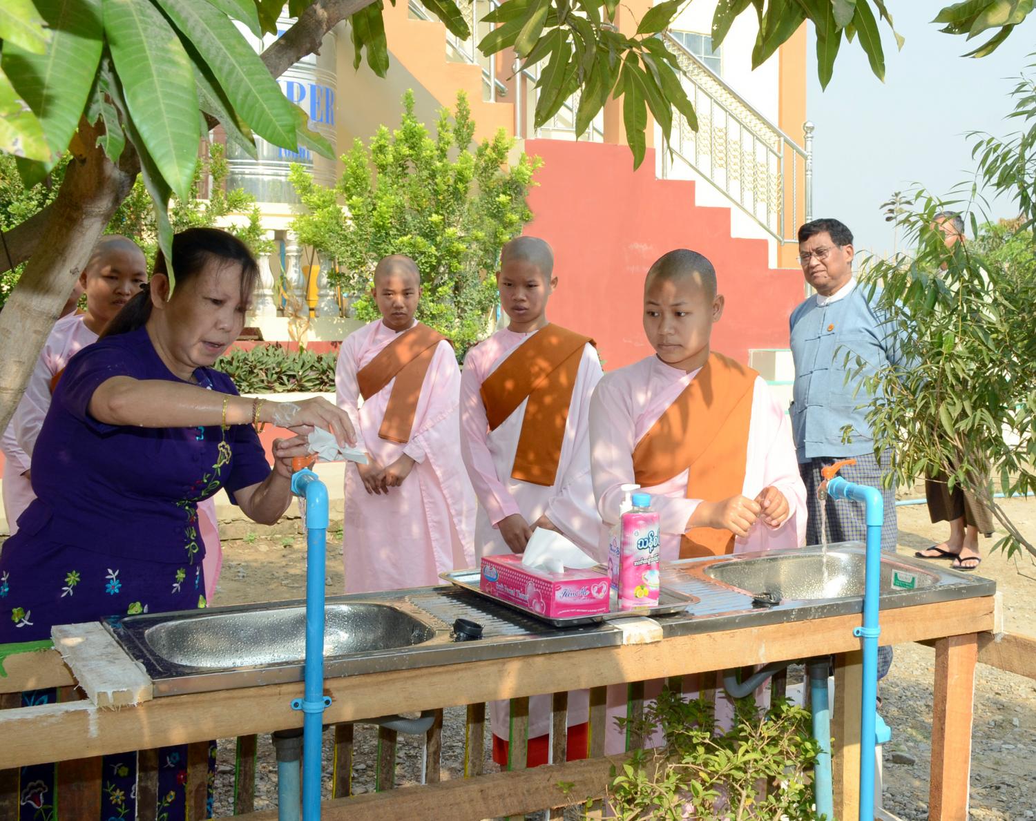 ထို့နောက် လူမှုဝန်ထမ်းဦးစီးဌာန ညွှန်ကြားရေးမှူးချုပ် ဒေါက်တာ စန်းစန်းအေးနှင့် တာဝန်ရှိသူ များက စနစ်တကျလက်ဆေးနည်းများကို လက်တွေ့သရုပ်ပြဆောင်ရွက်သည်။ ယင်းနောက် ဒုတိယဝန်ကြီးနှင့်အဖွဲ့သည် ဆရာတော်နှင့် သီလရှင်ဆရာကြီးတို့အား လှူဖွယ်ဝတ္ထုများ ဆပ်ကပ် လှူဒါန်းခဲ့ပြီး ကလေးသူငယ်များနှင့် သီလရှင်လေးများအတွက် ကြက်ဥ၊ ပဲနို့နှင့် ဆပ်ပြာခဲများကို လှူဒါန်းခဲ့ကြောင်း သိရသည်။