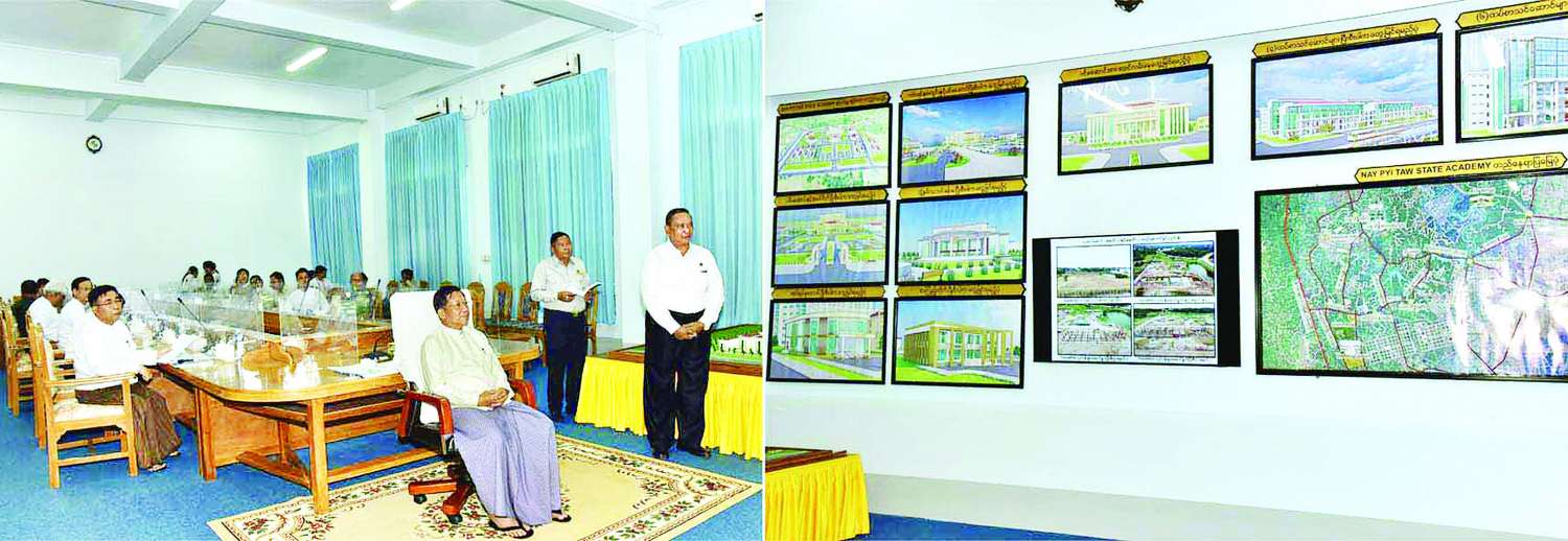 ဦးစွာ အစည်းအဝေးခန်းမတွင် ဆောက်လုပ်ရေးဝန်ကြီးဌာန ပြည်ထောင်စုဝန်ကြီးဦးရွှေလေးက တည်ဆောက်ရေး လုပ်ငန်းများ ဆောင်ရွက်နေမှု အခြေအနေများကို လည်းကောင်း၊ ပညာရေးဝန်ကြီးဌာန ပြည်ထောင်စုဝန်ကြီး ဒေါက်တာညွန့်ဖေက Naypyitaw State Academy တည်ဆောက်ပြီးစီးပါက သင်ကြားရေးအတွက် မဟာဌာနများနှင့် အုပ်ချုပ်ရေးဌာနများတွင် ဝန်ထမ်းများ ခန့်အပ်တာဝန်ပေးရန် လျာထားမှု အခြေအနေများ၊ သင်ကြားမှုများ ဆောင်ရွက်နိုင်မည့် အခြေအနေများ၊ ပညာရေးဝန်ထမ်းများခန့်အပ်ရာတွင် စနစ်တကျ စိစစ်ရွေးချယ်ခန့်အပ် ဆောင်ရွက်သွားမည့် အခြေအနေများ၊ ပေးအပ်သွားမည့်ဘွဲ့အမျိုးအစားများ လျာထားမှု၊ အဆောက်အဦများအလိုက် သင်ကြားရေးဌာနများ ဖွင့်လှစ်ဆောင်ရွက်ရန် လျာထားမှု အခြေအနေများကို လည်းကောင်း အသီးသီး ရှင်းလင်းတင်ပြကြသည်။