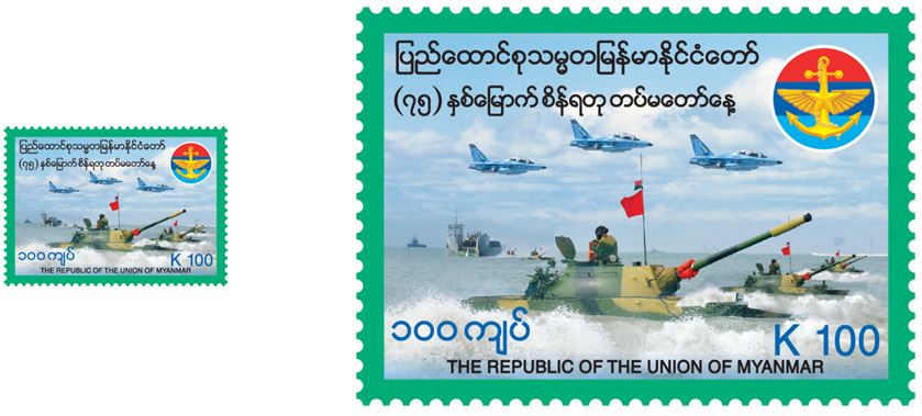 ပို့ဆောင်ရေးနှင့်ဆက်သွယ်ရေးဝန်ကြီးဌာန၊ မြန်မာ့စာတိုက်လုပ်ငန်း မှ (၇၅)နှစ်မြောက်၊ စိန်ရတု တပ်မတော်နေ့ အထိမ်းအမှတ် အထူးထုတ် စာပို့တံဆိပ်ခေါင်းသစ်(၃)မျိုး (၅၀၀/-ကျပ်တန်၊ ၂၀၀/-ကျပ်တန်၊ ၁၀၀/- ကျပ်တန်) အား ၂၀၂၀ ပြည့်နှစ်၊ မတ်(၂၇)ရက်၊ မြန်မာသက္ကရာဇ် ၁၃၈၁ ခုနှစ်၊ တန်ခူးလဆန်း(၄)ရက်(သောကြာနေ့)၊ နံနက် ၉ နာရီခွဲမှ စတင်၍ နေပြည်တော်ဗဟိုစာတိုက်ကြီး၊ ရန်ကုန်စာတိုက်ကြီး၊ မန္တလေး စာတိုက်ကြီးတို့နှင့် တိုင်းဒေသ ကြီး / ပြည်နယ်များရှိ စာတိုက်ကြီးများတွင် ရောင်းချပေးသွားမည်ဖြစ်သည်။