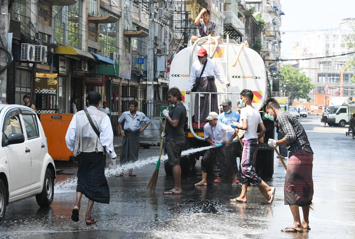COVID - 19 ရောဂါကာကွယ်ရေးအတွက် ရန်ကုန်တိုင်းဒေသကြီး ပန်းဘဲတန်းမြို့နယ်ရှိ ဗိုလ်ဆွန်ပက်လမ်းနှင့် လမ်း(၃၀)အထက် ဘလောက်တို့တွင် ယနေ့မွန်းလွဲ ၂ နာရီမှစတင်၍ ရေဖျန်းခြင်းနှင့် ပိုးသတ်ဆေး ဖျန်းခြင်းလုပ်ငန်းများကို ဆောင်ရွက်ခဲ့သည်။