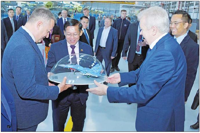 ဦးစွာ နိုင်ငံတော်စီမံအုပ်ချုပ်ရေးကောင်စီဥက္ကဋ္ဌ နိုင်ငံတော်ဝန်ကြီးချုပ်နှင့်အဖွဲ့ဝင်များအား Irkutsk Aviation Plant-Irkutsk Corporation Branch မှ အထွေထွေညွှန်ကြားရေးမှူးချုပ် Mr. Veprev Aleksey Alexandrovich နှင့် အဖွဲ့ဝင်များက ကြိုဆိုနှုတ်ဆက်ကြသည်။ ထို့နောက် အလုပ်ရုံအတွင်း လှည့်လည်၍ MC-21 300 ခရီးသည်တင်လေယာဉ်ကြီးများ ထုတ်လုပ်ရန်အတွက် အစိတ်အပိုင်းတစ်ခုချင်းစီအလိုက် sector များခွဲကာ Robotic system များ၊ Automatic Machine များဖြင့် တပ်ဆင်နေမှုများ၊ ထိုမှတစ်ဆင့် လေယာဉ်ကိုယ်ထည်ပိုင်း၊ တောင်ပံပိုင်း၊ အင်ဂျင်ပိုင်းများကို အဆင့်ဆင့် တပ်ဆင်တွဲဆက်နေမှုများ၊ စက်ခေါင်းခန်းအတွင်း ထိန်းချုပ်မှု System များ၊ အတွင်းပိုင်း အပြင်အဆင်များကို အဆင့်မြှင့်တင် ဆောင်ရွက်ထားရှိများ၊ လေယာဉ်ထုတ်လုပ်နေမှု အခြေအနေများနှင့် လေယာဉ်၏ စွမ်းဆောင်ရည်ပိုင်းနှင့် ကြံ့ခိုင်ရေးပိုင်းတို့အား စမ်းသပ်စစ်ဆေးလျက်ရှိသည့် အခြေအနေများ၊ မြန်မာ့တပ်မတော်အတွက် ထုတ်လုပ်လျက်ရှိသည့် Su-30 တိုက်ခိုက်ရေးလေယာဉ်များ ထုတ်လုပ်တပ်ဆင်နေမှု၊ ထုတ်လုပ်ပြီးလေယာဉ်များအား လေ့ကျင့်စမ်းသပ်နေမှု အခြေအနေများနှင့်ပတ်သက်၍ ရှင်းလင်းတင်ပြသည်။ ရှင်းလင်းတင်ပြမှုများနှင့် ပတ်သက်၍ နိုင်ငံတော်စီမံအုပ်ချုပ်ရေးကောင်စီဥက္ကဋ္ဌ နိုင်ငံတော်ဝန်ကြီးချုပ်က သိရှိလိုသည်များ ပြန်လည်မေးမြန်း ဆွေးနွေးပြောကြားသည်။