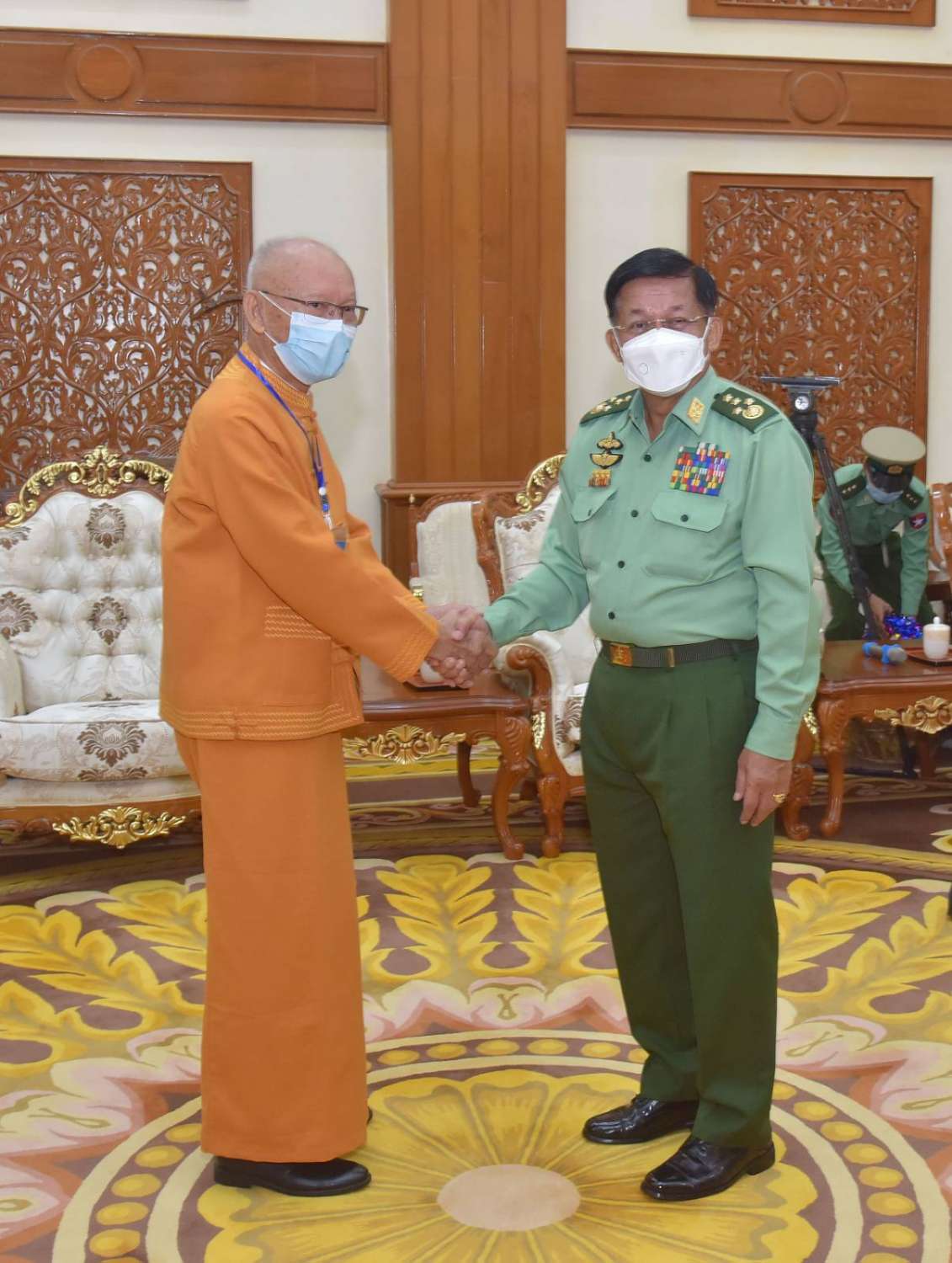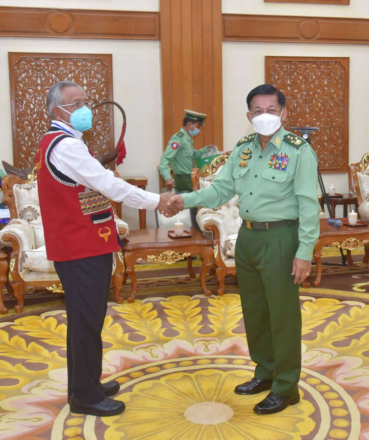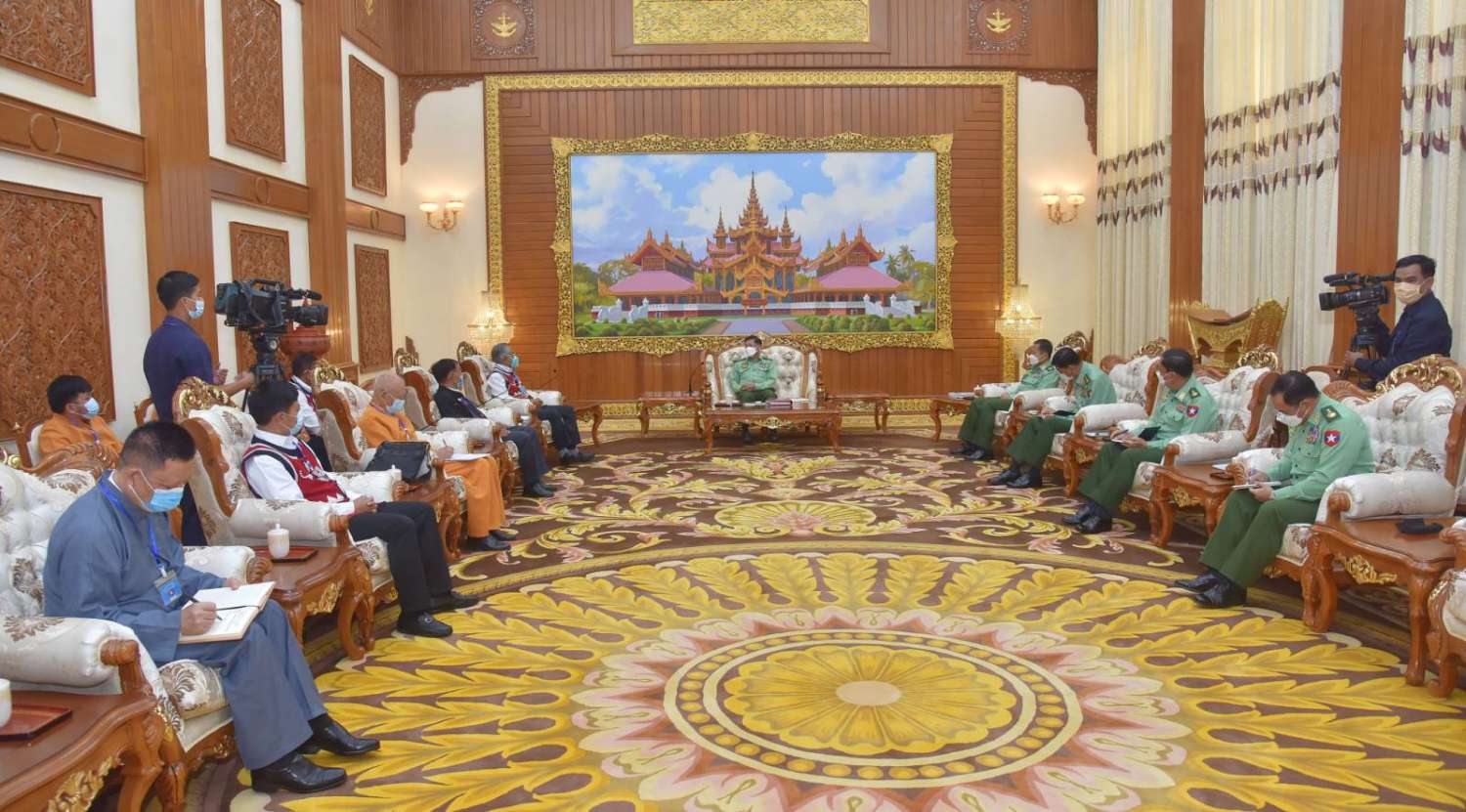 နိုင်ငံတော်စီမံအုပ်ချုပ်ရေးကောင်စီဥက္ကဋ္ဌ တပ်မတော်ကာကွယ်ရေးဦးစီးချုပ် ဗိုလ်ချုပ်မှူးကြီး မင်းအောင်လှိုင်သည် “ဝ”ပြည် သွေးစည်းညီညွတ်ရေးပါတီ (UWSP) ဒုတိယဥက္ကဋ္ဌ ဦးလော့ယာကု၊ အမျိုးသားဒီမိုကရက်တစ်မဟာမိတ်အဖွဲ့ (NDAA) ဒုတိယဥက္ကဋ္ဌ ဦးစန်ပေ့နှင့် ရှမ်းပြည်တိုးတက်ရေးပါတီ (SSPP) ဒုတိယဥက္ကဋ္ဌ(၂) စဝ်ခွန်ဆိုင်တို့ ဦးဆောင်သည့် ငြိမ်းချမ်းရေးကိုယ်စားလှယ်အဖွဲ့အား ယနေ့နံနက်ပိုင်းတွင် နေပြည်တော်ရှိ ဘုရင့်နောင်ရိပ်သာ ဧည့်ခန်းမဆောင်၌ တွေ့ဆုံ၍ ငြိမ်းချမ်းရေးဆိုင်ရာကိစ္စရပ်များ ဆွေးနွေးသည်။