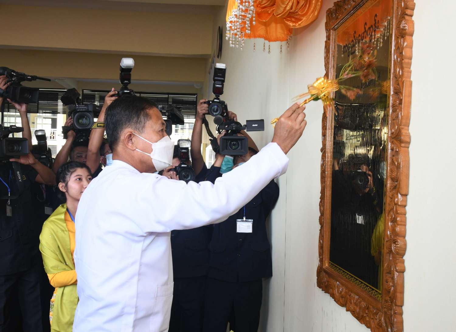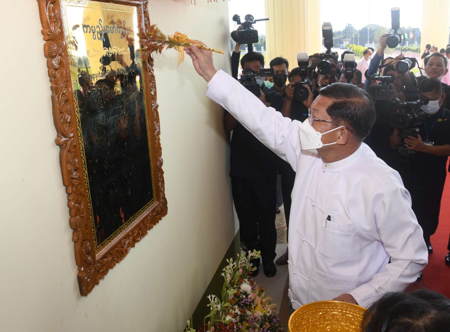 ယင်းနောက် နိုင်ငံတော်စီမံအုပ်ချုပ်ရေးကောင်စီဥက္ကဋ္ဌ နိုင်ငံတော်ဝန်ကြီးချုပ် ဗိုလ်ချုပ်မှူးကြီး မင်းအောင်လှိုင်က Naypyitaw State Academy ဆိုင်းဘုတ်ကို စက်ခလုတ်နှိပ် ဖွင့်လှစ်ပေးပြီး Naypyitaw State Academy ကမ္ပည်းမော်ကွန်းကို အမွှေးနံ့သာရည်များ ပက်ဖျန်းပေးသည်။