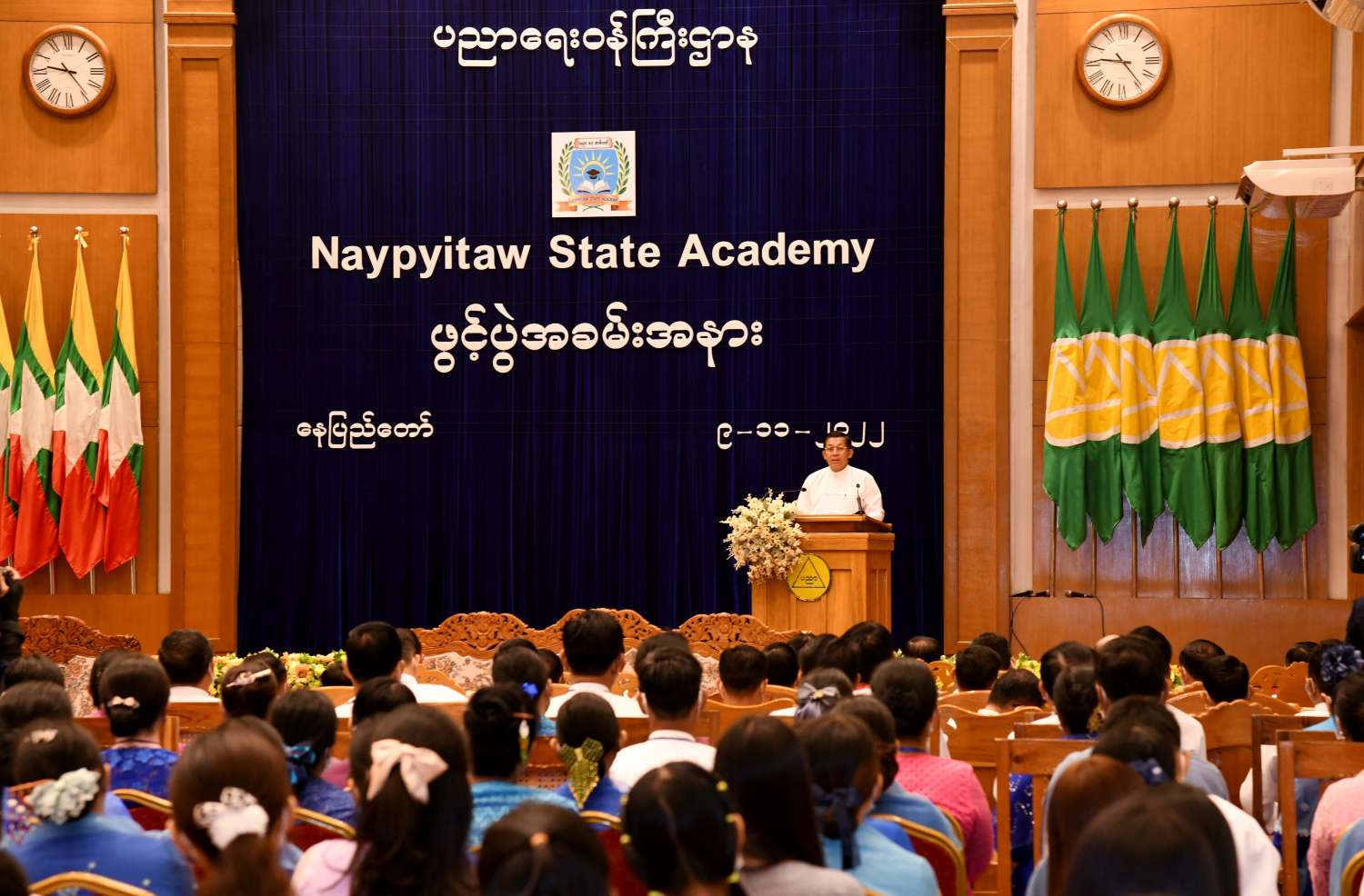 ပြည်ထောင်စုသမ္မတမြန်မာနိုင်ငံတော် ပညာရေးဝန်ကြီးဌာန Naypyitaw State Academy ဖွင့်ပွဲအခမ်းအနားကို ယနေ့နံနက်ပိုင်းတွင် ကျင်းပပြုလုပ်ရာ နိုင်ငံတော်စီမံအုပ်ချုပ်ရေးကောင်စီဥက္ကဋ္ဌ နိုင်ငံတော်ဝန်ကြီးချုပ် ဗိုလ်ချုပ်မှူးကြီး မင်းအောင်လှိုင် တက်ရောက်ဖွင့်လှစ်ပေးပြီး အမှာစကားပြောကြားသည်။