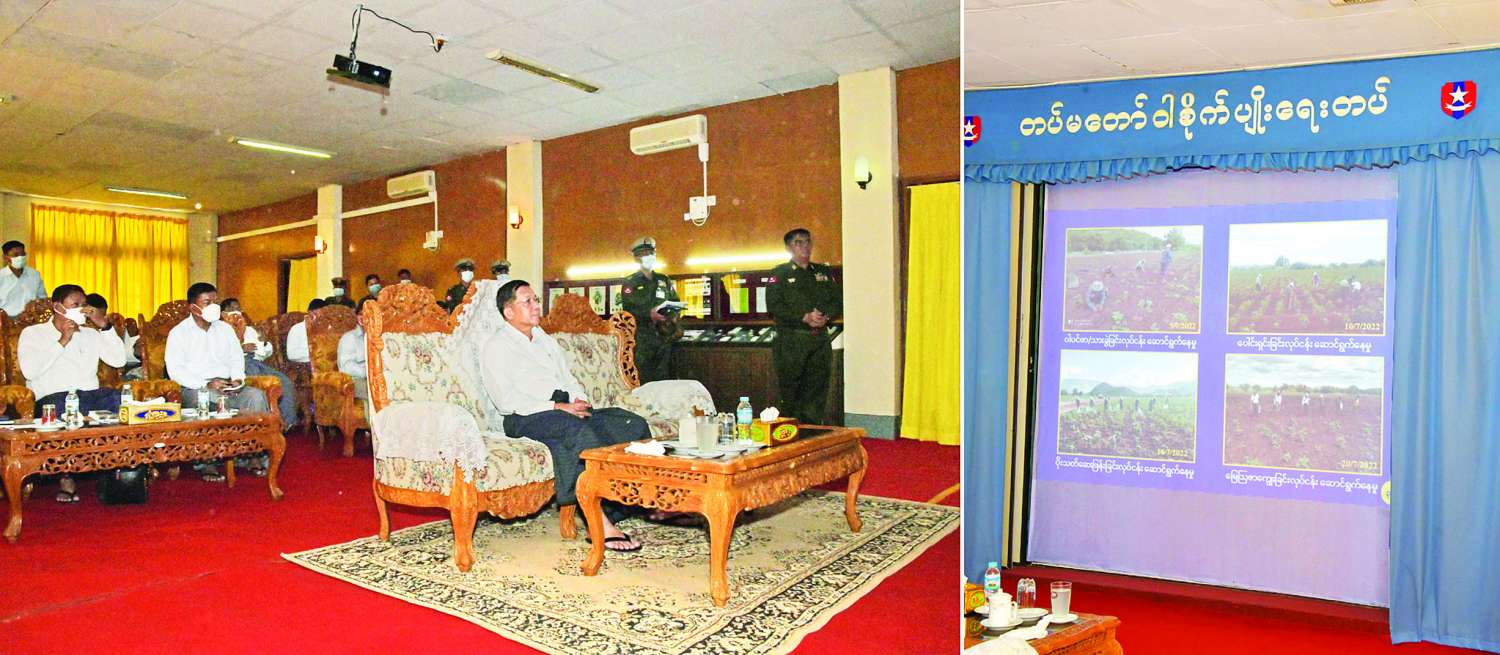 ဦးစွာ နိုင်ငံတော်စီမံအုပ်ချုပ်ရေးကောင်စီဥက္ကဋ္ဌ တပ်မတော်ကာကွယ်ရေးဦးစီးချုပ်နှင့် အဖွဲ့ဝင်များအား စစ်လက်နက်ပစ္စည်းညွှန်ကြားရေးမှူးရုံး၊ ညွှန်ကြားရေးမှူး ဗိုလ်ချုပ် ဝင်းလွင်က တပ်မတော်ဝါစိုက်ပျိုးရေးတပ်(ပွင့်ဖြူ) တပ်သမိုင်းအကျဉ်း၊ ရည်မှန်းချက်တာဝန်နှင့် စိုက်ပျိုးရာသီအလိုက် လုပ်ငန်းစီမံချက်ဇယားချမှတ်၍ ဆောင်ရွက်လျက်ရှိမှု၊ တပ်မတော်ဝါ စိုက်ပျိုးရေးတပ်(လွန်ကျော်)၏ လုပ်ငန်းဆောင်ရွက်နေမှုအခြေအနေများနှင့် စိုက်ဧကအလိုက် စိုက်ပျိုးရေ လုံလောက်စွာရရှိရေး ဆောင်ရွက်လျက်ရှိသည့် အခြေအနေများကို ရှင်းလင်းတင်ပြသည်။