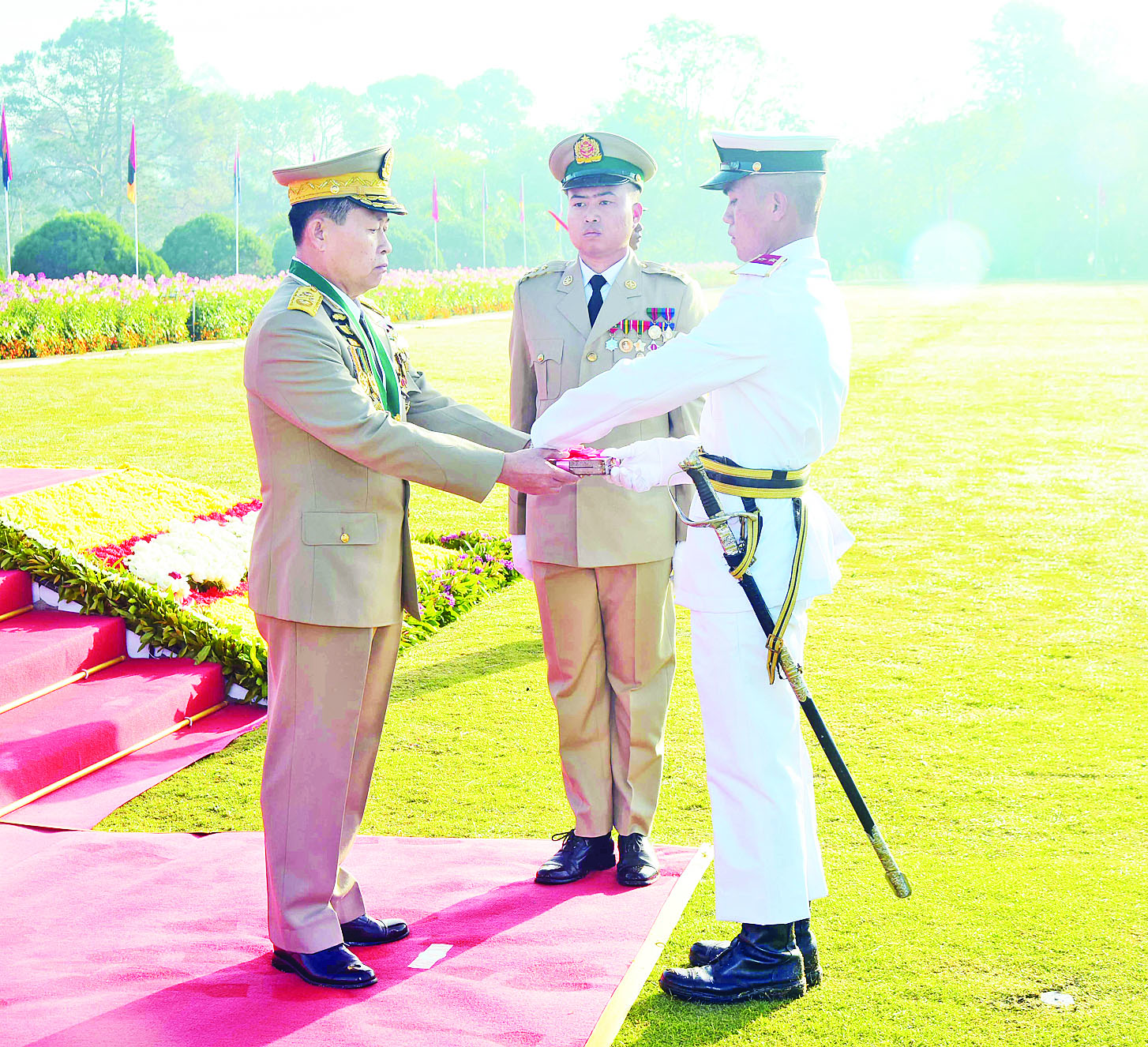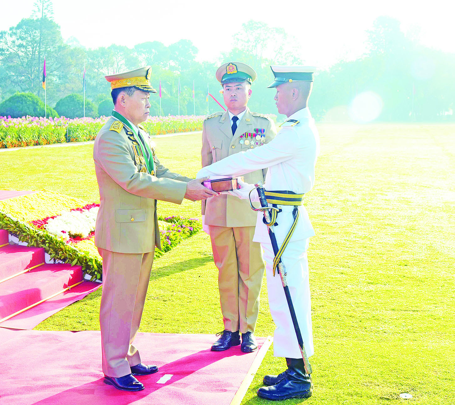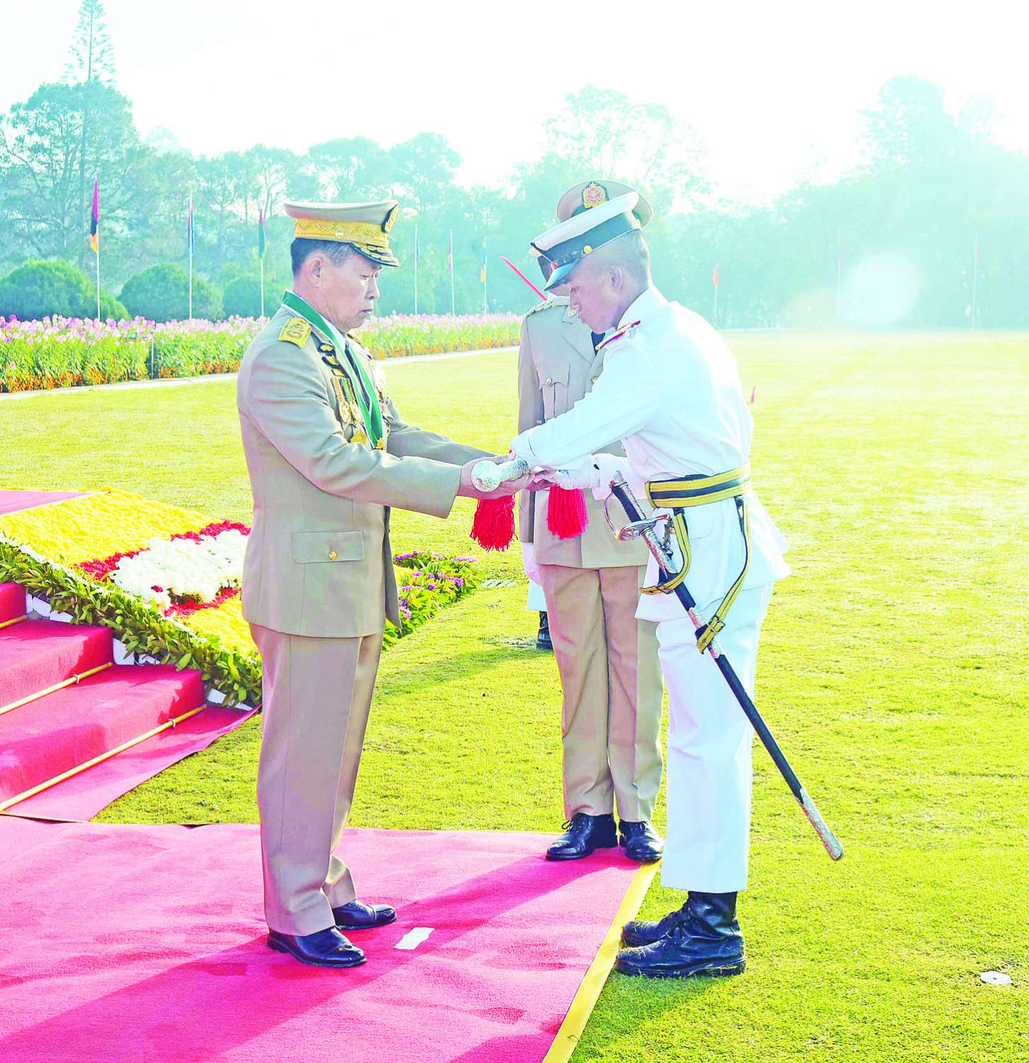 ယင်းနောက် နိုင်ငံတော်စီမံအုပ်ချုပ်ရေးကောင်စီ ဒုတိယဥက္ကဋ္ဌ ဒုတိယတပ်မတော်ကာကွယ်ရေးဦးစီးချုပ် ကာကွယ်ရေးဦးစီးချုပ်(ကြည်း) ဒုတိယဗိုလ်ချုပ်မှူးကြီး သရေစည်သူစိုးဝင်းသည် ဗိုလ်လောင်းတပ်ခွဲများ၏ အလေးပြုခြင်းကို ခံယူပြီးနောက် စစ်ရေးပြအခမ်းအနားမှ ပြန်လည်ထွက်ခွာသည်။