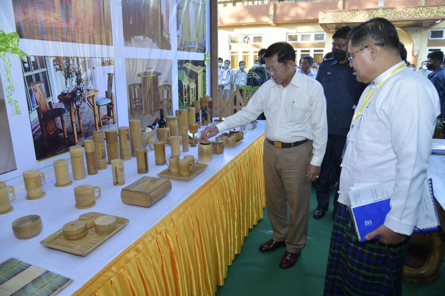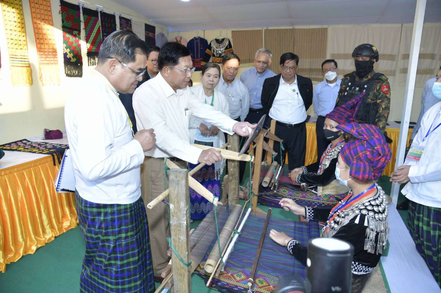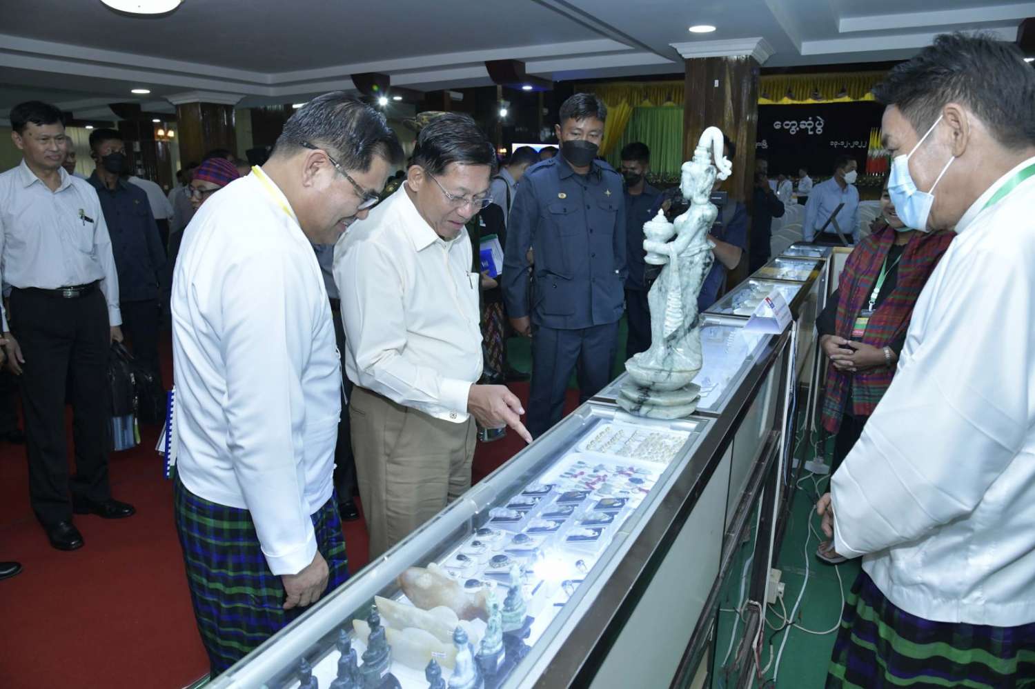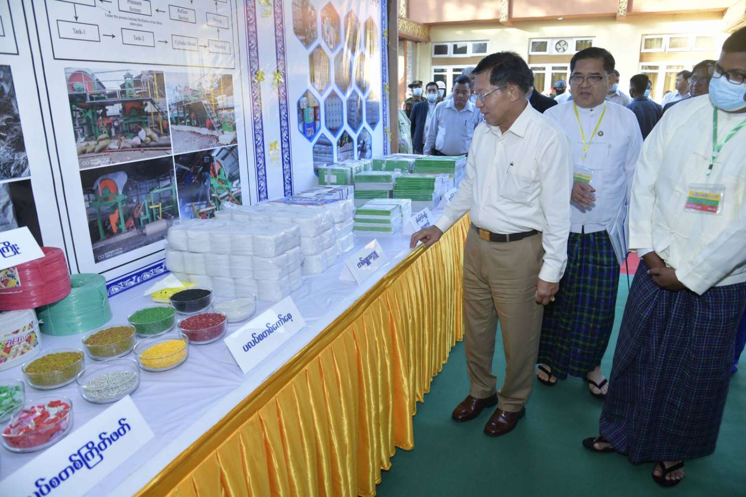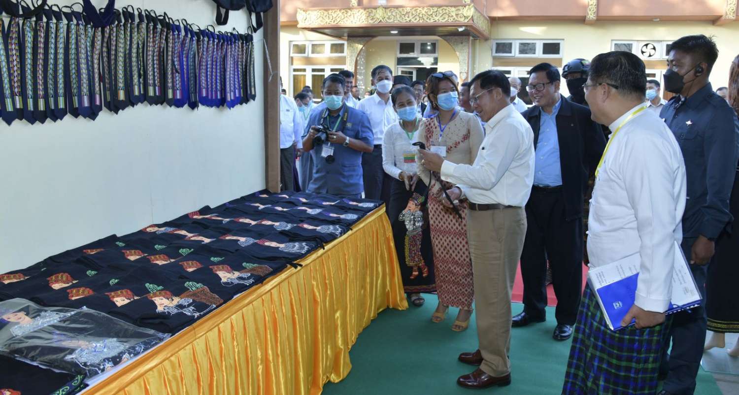 ထို့နောက် နိုင်ငံတော်စီမံအုပ်ချုပ်ရေးကောင်စီဥက္ကဋ္ဌ နိုင်ငံတော်ဝန်ကြီးချုပ်သည် ခင်းကျင်းပြသထားသည့် သယံဇာတတွင်းထွက်ထုတ်ကုန်များ၊ စားသောက်ကုန်၊ လူသုံးကုန်၊ စက်မှုလက်မှုထုတ်ကုန်၊ ရိုးရာလက်မှုထုတ်ကုန်များ၊ အဝတ်အထည်များ၊ တိုင်းရင်းဆေးများ စသည့်ထုတ်ကုန်ပစ္စည်းများ ခင်းကျင်းပြသထားရှိမှုများကို ပြကွက်တစ်ခုချင်းစီအလိုက် စိတ်ဝင်တစားဖြင့်လေ့လာခဲ့ပြီး ဈေးကွက်ရရှိမှုအခြေအနေများကို မေးမြန်းဆွေးနွေးရာလုပ်ငန်းအလိုက် စီးပွားရေးလုပ်ငန်းရှင်များက လိုက်လံရှင်းလင်းတင်ပြခဲ့ကြကြောင်း သတင်းရရှိသည်။