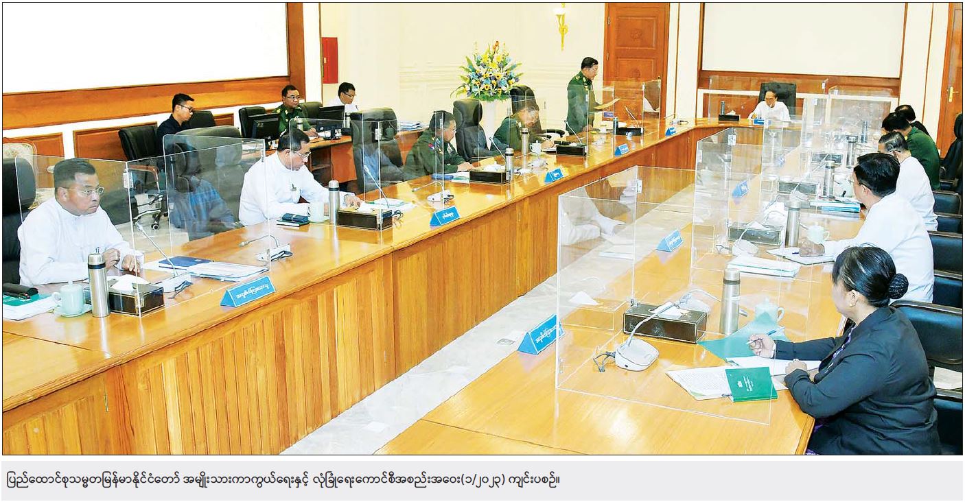 ထို့နောက် ပြည်ထဲရေးဝန်ကြီးဌာန ပြည်ထောင်စုဝန်ကြီးက ဆွေးနွေးတင်ပြရာတွင် လုံခြုံရေး၊ တည်ငြိမ်အေးချမ်းရေးနှင့် တရားဥပဒေစိုးမိုးရေးနှင့် ပတ်သက်၍ မဲမသမာမှုကြောင့် တပ်မတော်မှ နိုင်ငံတော်တာဝန်များကို ထမ်းဆောင်ခဲ့ရကြောင်း၊ နိုင်ငံတော်စီမံအုပ်ချုပ်ရေးကောင်စီမှ တာဝန်ယူပြီးနောက်ပိုင်း ငြိမ်းချမ်းစွာ ဆန္ဒပြမှုများမှတစ်ဆင့် ဆူပူမှု၊ အကြမ်းဖက်မှုနှင့် ဖျက်ဆီးသတ်ဖြတ်မှုများ ဖြစ်ပေါ်ခဲ့ကြောင်း၊ လက်ရှိအချိန်တွင် ဆူပူဆန္ဒပြမှုများ မရှိတော့သော်လည်း အကြမ်းဖက်မှုများရှိနေ ဆဲဖြစ်ကြောင်း၊ လက်ရှိအခြေအနေတွင် ရွေးကောက်ပွဲ ပြုလုပ်နိုင်ခြင်းမရှိစေရန် အကြမ်းဖက်သမားများက အကြမ်းဖက်နှောင့်ယှက်ခြင်း၊ သတ်ဖြတ်ခြင်း၊ ဖျက်ဆီးခြင်းများကို လုပ်ဆောင်လျက်ရှိကြောင်း၊ အုပ်ချုပ်မှုယန္တရားများ လည်ပတ်နိုင်ရန်အတွက် ရပ်ကွက်၊ ကျေးရွာအုပ်ချုပ်ရေးမှူးများ အချို့နေရာများတွင် ခန့်အပ်ရန် ကျန်ရှိနေသေးကြောင်း၊ မိမိ တင်ပြခဲ့သည့် အထက်ပါအခြေအနေများအရ NUG၊ CRPH နှင့် PDF အမည်ခံ အကြမ်းဖက်သမားများ အနေဖြင့် လာမည့်ရွေးကောက်ပွဲကျင်းပနိုင်ခြင်း မရှိစေရန်အတွက် ရွေးကောက်ပွဲအကြိုကာလ ရွေးကောက်ပွဲကော်မရှင်ရုံးများ၊ လဝကရုံးများနှင့် နိုင်ငံရေးပါတီရုံးများကို မီးရှို့ မိုင်းထောင် ဖောက်ခွဲခြင်း၊ နိုင်ငံရေးပါတီဝင်များနှင် လွှတ်တော်ကိုယ်စားလှယ် လောင်းများကို ခြိမ်းခြောက်သတ်ဖြတ်ခြင်းများ၊ အုပ်ချုပ်မှုယန္တရားများ မလည်ပတ်နိုင်စေရန်အတွက် ရာအိမ်မှူး၊ ဆယ်အိမ်မှူးနှင့် ရပ်ကွက်အုပ်ချုပ်ရေးမှူးများ လုပ်ကြံသတ်ဖြတ်ခြင်းများရှိသကဲ့သို့ ပြည်သူ များအကြား အကြောက်တရားဖြင့် လွှမ်းမိုးနိုင်ရန် အတွက် ၎င်းတို့နှင့် အယူအဆမတူသည့်သူများကို ဒလန်ဟု စွပ်စွဲပြီး လုပ်ကြံသတ်ဖြတ်မှုများကို လုပ်ဆောင်လာနိုင်ပါကြောင်း၊ လုံခြုံရေး၊ တည်ငြိမ် အေးချမ်းရေးနှင့် တရားဥပဒေစိုးမိုးရေး ရှုထောင့်အရ ကြည့်ရမည်ဆိုပါက အကြမ်းဖက်အုပ်စုများ တဖြည်းဖြည်း ချုပ်ငြိမ်းသွားသည့် အခြေအနေအထိ လုပ်ဆောင်သွားရန် အချိန်အတိုင်းအတာ တစ်ခုအထိ လိုအပ်ပါကြောင်း ဆွေးနွေးတင်ပြသည်။