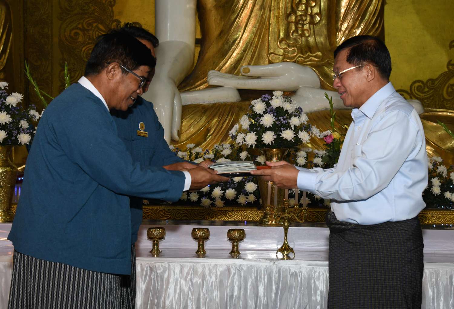 ထို့နောက် နိုင်ငံတော်စီမံအုပ်ချုပ်ရေးကောင်စီဥက္ကဋ္ဌ နိုင်ငံတော်ဝန်ကြီးချုပ်က စေတီတော်မြတ်ကြီးအတွက် ဘက်စုံအလှူငွေများပေးအပ်လှူဒါန်းရာ ဂေါပကအဖွဲ့မှ တာဝန်ရှိသူများကလက်ခံရယူပြီး ဓမ္မလက်ဆောင်များ ပြန်လည်ပေးအပ်သည်။