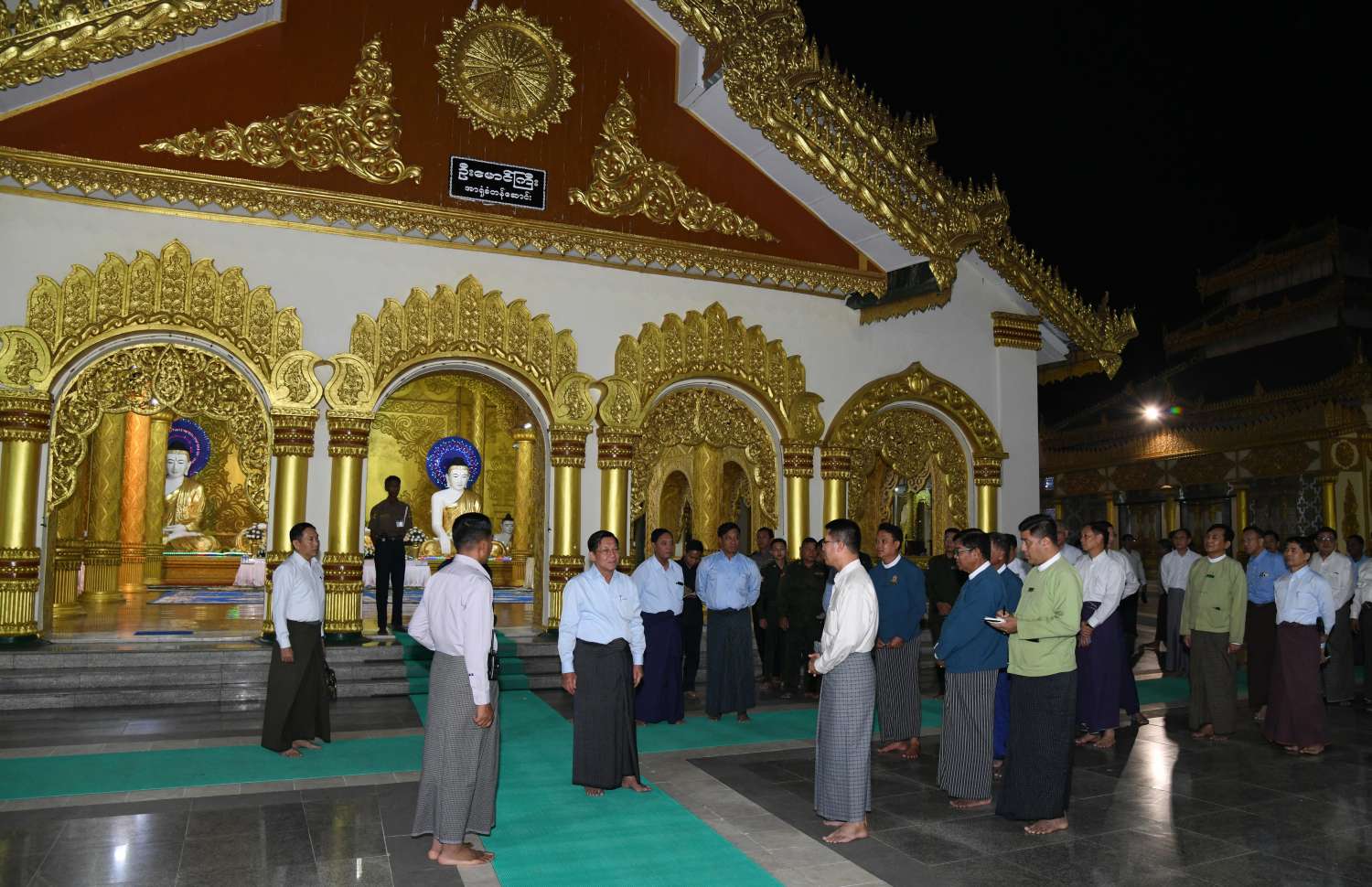 ဦးစွာ နိုင်ငံတော်စီမံအုပ်ချုပ်ရေးကောင်စီဥက္ကဋ္ဌ နိုင်ငံတော်ဝန်ကြီးချုပ်နှင့် အဖွဲ့ဝင်များအား ဂေါပကအဖွဲ့ဝင်များက ကြိုဆိုနှုတ်ဆက်ကြသည်။ ယင်းနောက် နိုင်ငံတော်စီမံအုပ်ချုပ်ရေး ကောင်စီဥက္ကဋ္ဌ နိုင်ငံတော်ဝန်ကြီးချုပ်နှင့် အဖွဲ့ဝင်များသည် စေတီတော်မြတ်ကြီးအား ဖူးမြော်ကြည်ညိုကာ ပန်း၊ ရေချမ်း၊ ဆီမီးများကပ်လှူပူဇော်သည်။