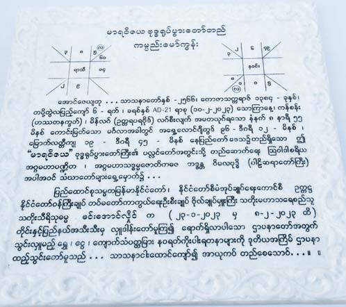 ထို့နောက် အခမ်းအနားမှူးက မင်္ဂလာအခါတော်စာတမ်းကို ဖတ်ကြားသည်။ မင်္ဂလာအချိန်တော်တွင် ပါဠိဆရာတော်ကြီးနှင့် ဦးဆောင်ဘုရားဒါယကာ နိုင်ငံတော်စီမံအုပ်ချုပ်ရေးကောင်စီဥက္ကဋ္ဌ နိုင်ငံတော်ဝန်ကြီးချုပ် ဗိုလ်ချုပ်မှူးကြီး မင်းအောင်လှိုင်တို့သည် မာရဝိဇယဗုဒ္ဓ ရုပ်ပွားတော်မြတ်ကြီး ရတနာပလ္လင်တော်ထက် ဗဟိုဌာနနေရာရှိ ဌာပနာတိုက်တော်များအတွင်းသို့ နိုင်ငံတစ်ဝန်းလုံးရှိ (၇) ရက်သားသမီး ဘုရားဒါယကာဒါယိကာမများ၊ စေတနာရှင် အလှူရှင်များ စုပေါင်းလှူဒါန်းထားသည့် အဖိုးတန်ရတနာရွှေငွေ ကျောက်သံပတ္တမြားများ၊ နိုင်ငံတကာမှ ငွေဒင်္ဂါးပြားများ အပါအဝင် ဌာပနာတော်ပစ္စည်းများ ထည့်သွင်းထားသည့် ရွှေသေတ္တာတော်များနှင့် မာရဝိဇယဗုဒ္ဓ ရုပ်ပွားတော်တည် မော်ကွန်းကမ္ပည်း ကျောက်စာတော်တို့ကို သတ်မှတ်ဌာပနာတော် နေရာအသီးသီးတွင် ထုံးတမ်းစဉ်လာများနှင့်အညီ သွင်းလှူ ပူဇော်ကြသည်။
