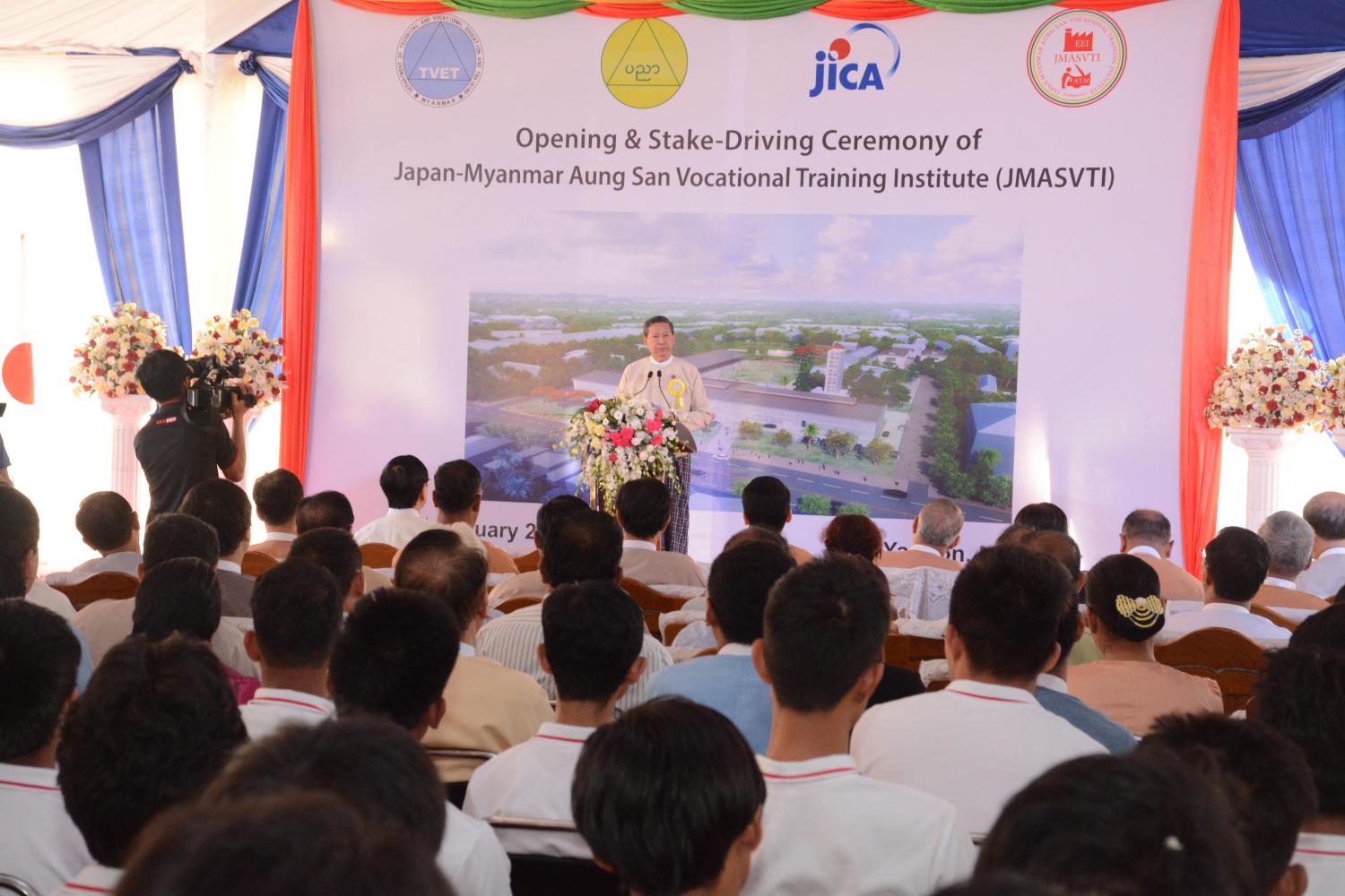 ပညာရေးဝန်ကြီးဌာန အနေဖြင့် အမျိုးသားပညာရေး မဟာဗျူဟာစီမံကိန်း (၂၀၁၆-၂၀၂၁)ကို ချမှတ် အကောင်အထည်ဖော် ဆောင်ရွက်လျက်ရှိရာ နည်းပညာနှင့် သက်မွေးပညာရေးကဏ္ဍ ပြုပြင်ပြောင်းလဲမှုကို အလေးထား ဆောင်ရွက်လျက်ရှိပါကြောင်း၊ နည်းပညာနှင့် သက်မွေးပညာရေးကို စိတ်ပါဝင်စား သင်ယူလိုသူများ လေ့လာသင်ယူခွင့်ရရှိရေး၊ အရည်အသွေး အာမခံမှုရှိရေးနှင့် ပိုမိုကောင်းမွန်သော နည်းပညာနှင့် သက်မွေးပညာရေး ဖြစ်ပေါ်လာစေရန် မဟာဗျုဟာများချမှတ်၍ အကောင်အထည်ဖော် ဆောင်ရွက်လျက် ရှိပါကြောင်း၊ လုပ်ငန်းခွင်လိုအပ်ချက်နှင့် ကိုက်ညီစေသည့် နည်းပညာနှင့် သက်မွေး ပညာရေး အစီအစဉ်များအနက် ယနေ့ဖွင့်လှစ်သည့် ဂျပန်-မြန်မာ အောင်ဆန်းသက်မွေးပညာ သင်တန်းကျောင်း စီမံကိန်းသည် မဟာဗျုဟာမြောက် အကောင်အထည်ဖော် ဆောင်ရွက် လျက်ရှိသော ပညာရေးဆိုင်ရာ စီမံကိန်းများအနက် လွန်စွာတန်ဖိုးရှိသော စီမံကိန်း တစ်ခုဖြစ်ပါကြောင်း၊ အစဉ်ပြောင်းလဲ တိုးတက်နေသော ဈေးကွက်လိုအပ်ချက်ကို စောင့်ကြည့်လေ့လာ သုံးသပ်ပြီး အရည်အချင်းရှိသော ကျွမ်းကျင်အတတ်ပညာရှင်များ လေ့ကျင့်သင်ကြား ပြုစု မွေးထုတ်ပေးနိုင်စေရေးအတွက် အထူးအလေးအနက်ထား၍ ဆောင်ရွက်ရန် လိုအပ်ပါကြောင်း တိုက်တွန်းပြောကြားသည်။