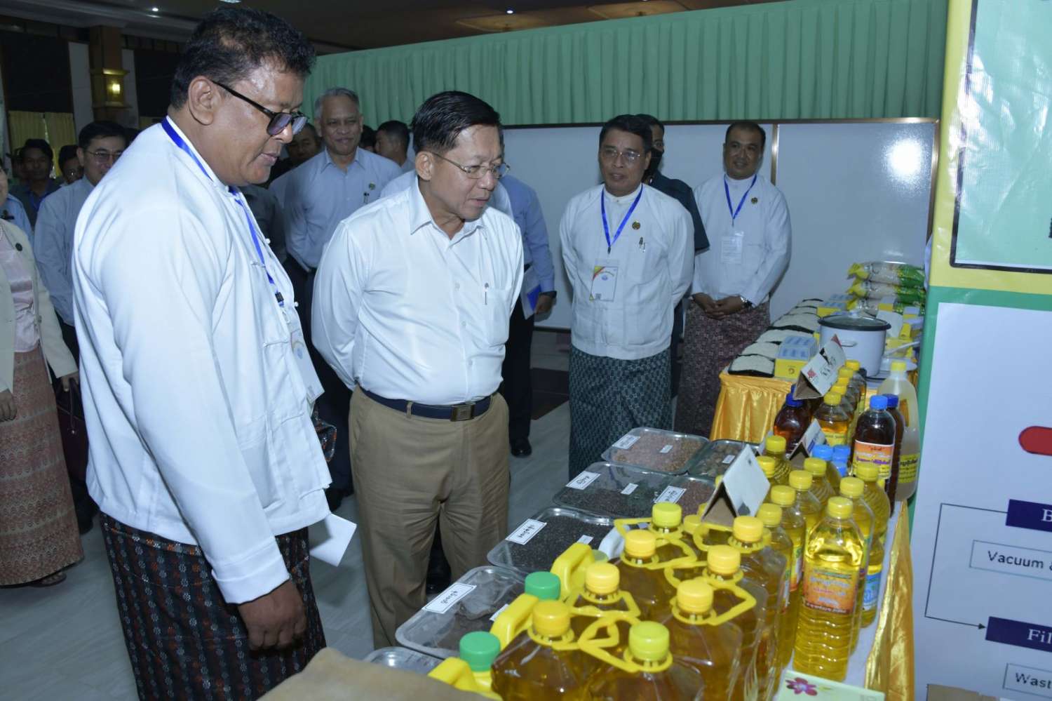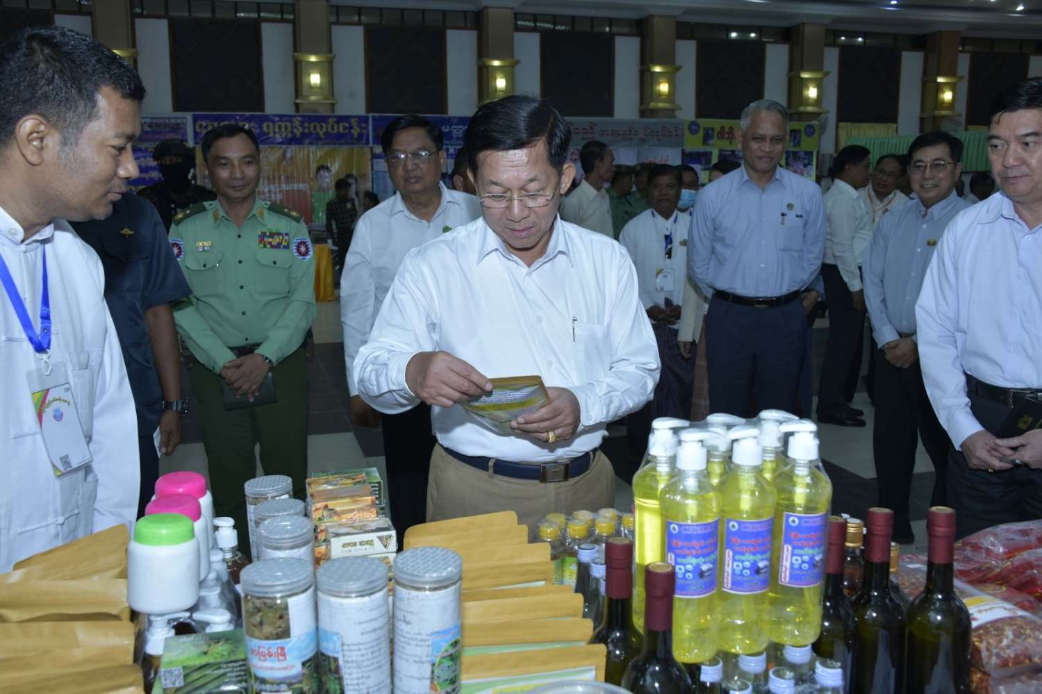 ယင်းနောက် နိုင်ငံတော်စီမံအုပ်ချုပ်ရေးကောင်စီဥက္ကဋ္ဌ နိုင်ငံတော်ဝန်ကြီးချုပ်သည် ခင်းကျင်းပြသထားသည့် ရေထွက်ကုန်ပစ္စည်းများ၊ စားသောက်ကုန်၊ လူသုံးကုန်၊ စက်မှုလက်မှုထုတ်ကုန်၊ ရိုးရာလက်မှုထုတ်ကုန်များ၊ အဝတ်အထည်များ စသည့် ထုတ်ကုန်ပစ္စည်းများ ခင်းကျင်းပြသထားရှိမှုများကို ပြကွက်တစ်ခုချင်းစီအလိုက် စိတ်ဝင်တစားဖြင့်လေ့လာခဲ့ပြီး ဈေးကွက်ရရှိမှုအခြေအနေများကို မေးမြန်းဆွေးနွေးရာ လုပ်ငန်းအလိုက် စီးပွားရေးလုပ်ငန်းရှင်များက လိုက်လံရှင်းလင်းတင်ပြခဲ့ကြောင်း သတင်းရရှိသည်။