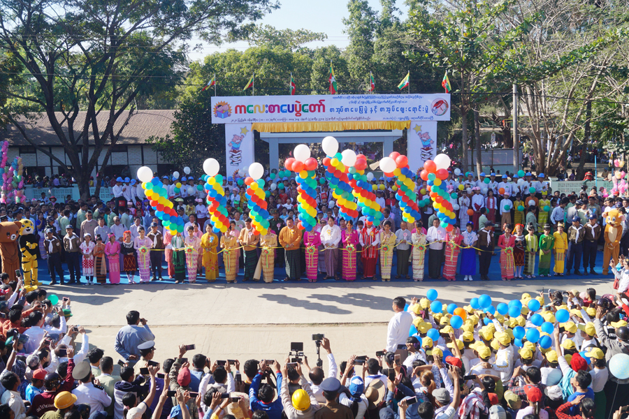 ရှေးဦးစွာ ကလေးစာပေပွဲတော် ဖွင့်ပွဲအခမ်းအနား ပထမပိုင်း အစီအစဉ်အဖြစ် ကျောင်းရှေ့ မုခ်ဦးတွင် ကျင်းပရာ ပြည်ထောင်စုဝန်ကြီးနှင့် ဧရာဝတီတိုင်းဒေသကြီး ဝန်ကြီးချုပ်တို့သည် တာဝန်ရှိသူများ၊ ထူးချွန် ကျောင်းသား/ကျောင်းသူများနှင့်အတူ အခမ်းအနားကို ဖဲကြိုးဖြတ်၍ ဖွင့်လှစ်ပေးကြပြီး မိုးပျံပူဖောင်းများ လွှင့်တင်ကြသည်။ ထို့နောက် စုပေါင်းမှတ်တမ်းတင် ဓာတ်ပုံရိုက်ကြသည်။