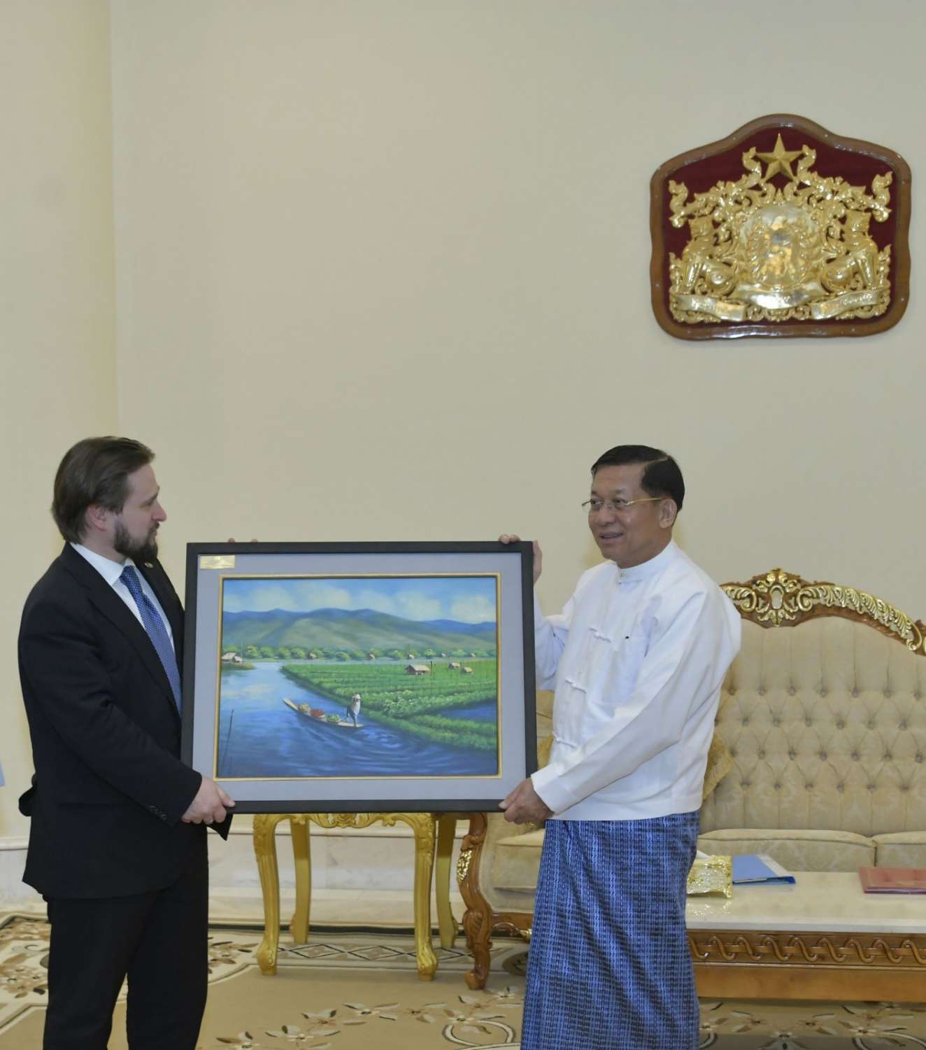 တွေ့ဆုံပွဲအပြီးတွင် နိုင်ငံတော်စီမံအုပ်ချုပ်ရေးကောင်စီဥက္ကဋ္ဌ နိုင်ငံတော်ဝန်ကြီးချုပ်နှင့် ရုရှားဖက်ဒရေးရှင်းနိုင်ငံ၊ ရော့စ်ကွန်ဂရက်ရင်းနှီးမြှုပ်နှံမှုရန်ပုံငွေအဖွဲ့မှ ညွှန်ကြားရေးမှူးတို့သည် အမှတ်တရလက်ဆောင်ပစ္စည်းများ အပြန်အလှန်ပေးအပ်ကြပြီး တက်ရောက်လာကြသူများနှင့်အတူ မှတ်တမ်းတင်ဓာတ်ပုံရိုက်ကူးကြသည်။