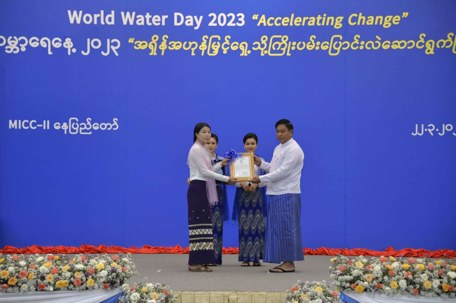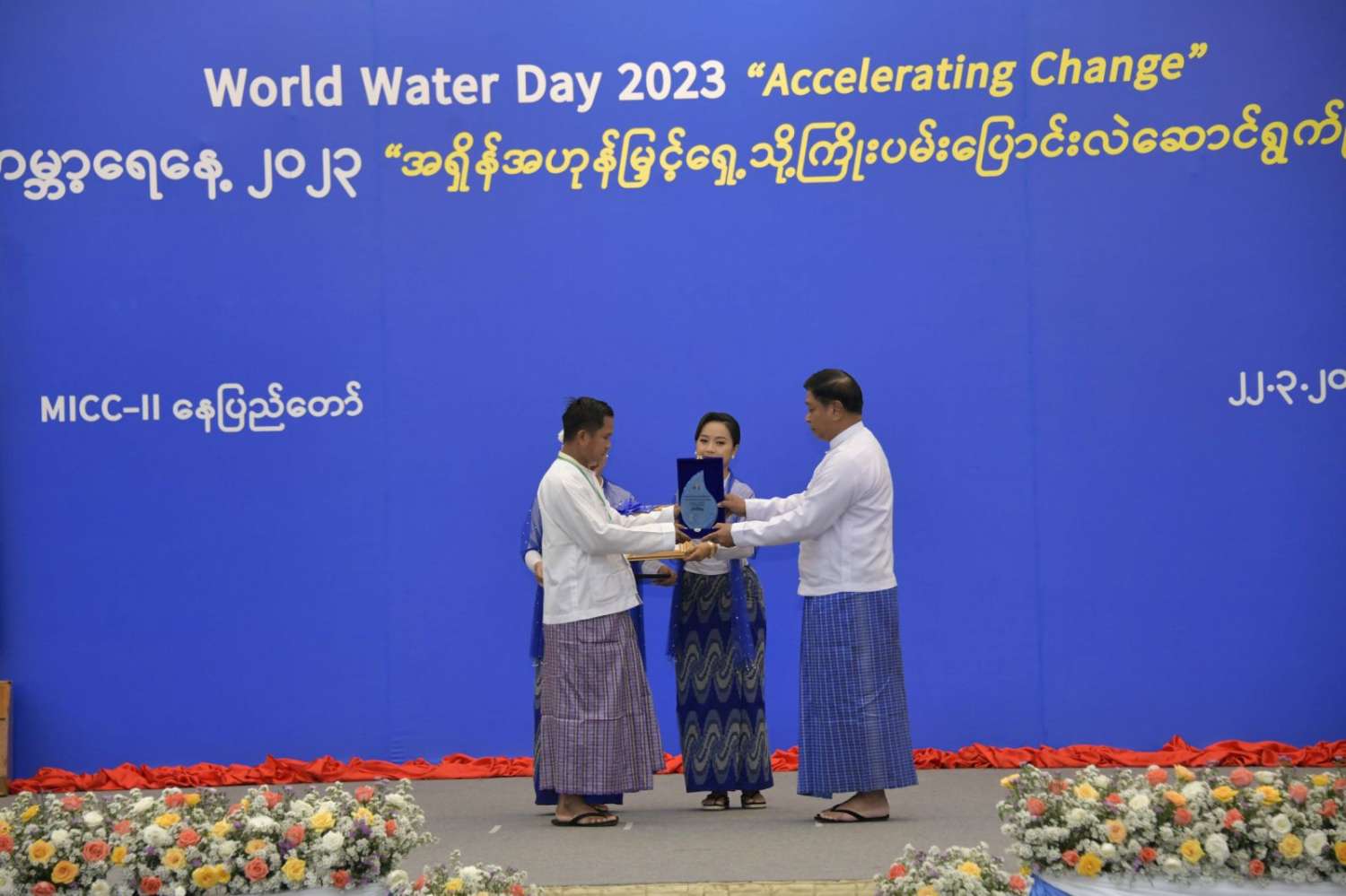 ယင်းနောက် အမျိုးသားအဆင့်ရေအရင်းမြစ်ကော်မတီ ဒုတိယဥက္ကဋ္ဌ၊  ဒုတိယဝန်ကြီးချုပ်၊ ပို့ဆောင်ရေးနှင့်ဆက်သွယ်ရေးဝန်ကြီးဌာန ပြည်ထောင်စုဝန်ကြီး ဗိုလ်ချုပ်ကြီး တင်အောင်စန်း က ကမ္ဘာ့ရေနေ့အထိမ်းအမှတ် ဆောင်းပါးပြိုင်ပွဲတွင် နှစ်သိမ့်ဆုရရှိခဲ့သူများကို ဆုများပေး အပ်ချီးမြှင့်သည်။