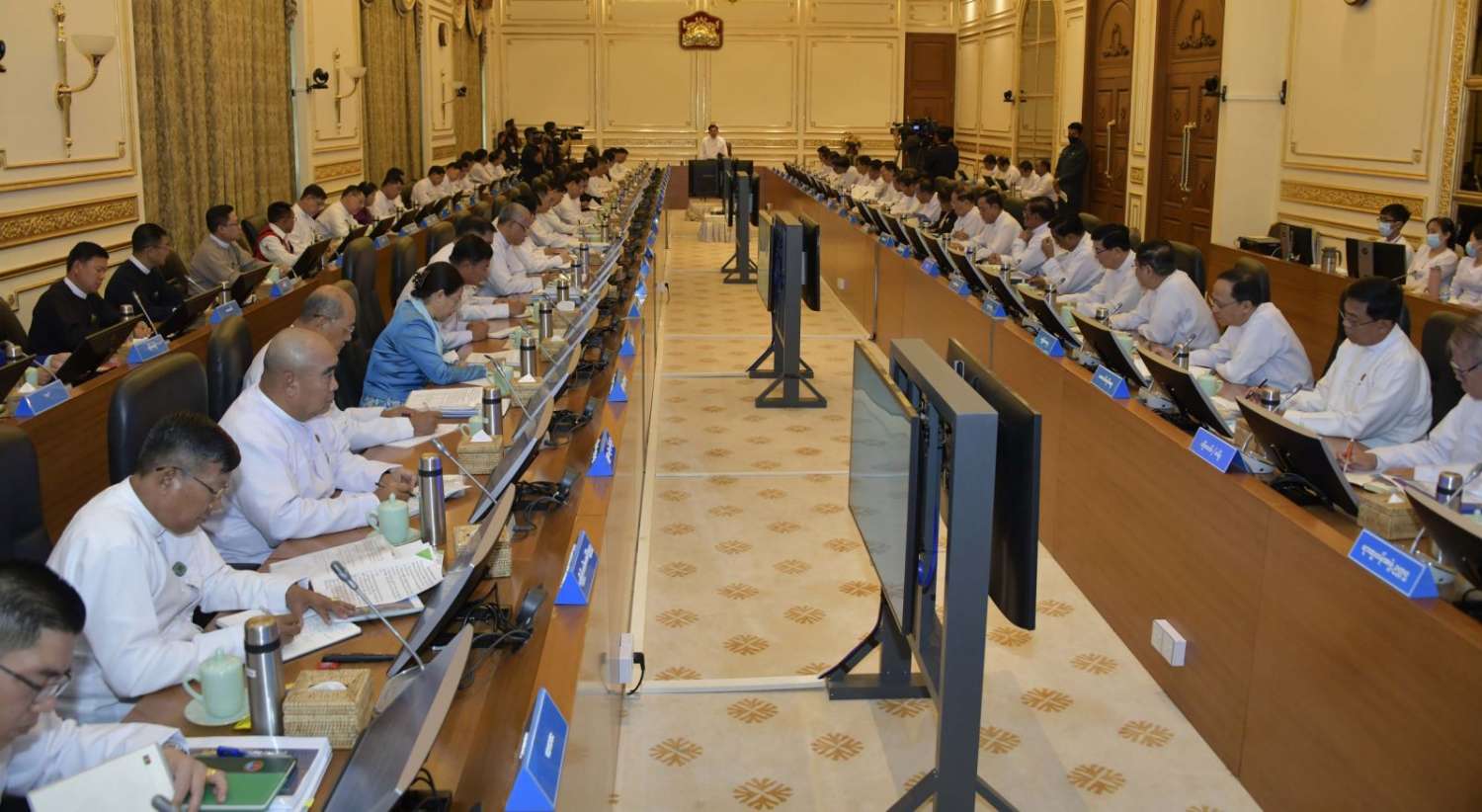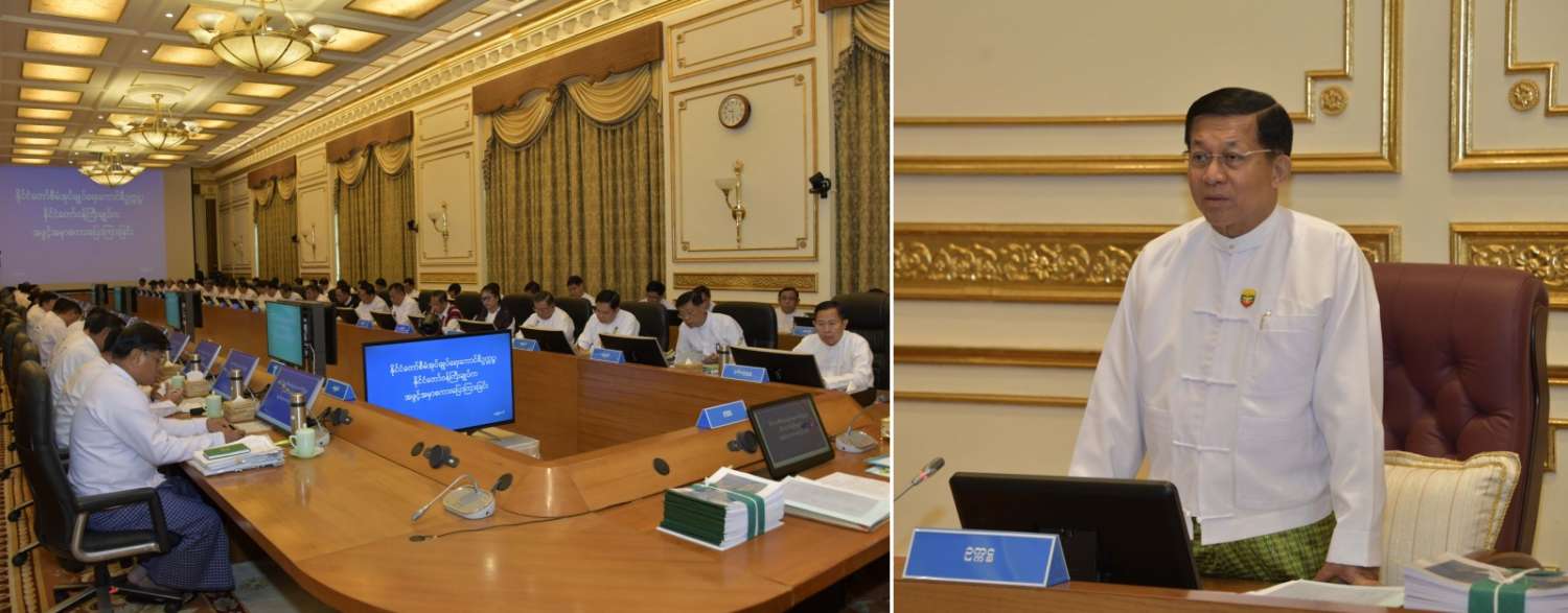 နိုင်ငံတော်စီမံအုပ်ချုပ်ရေးကောင်စီဥက္ကဋ္ဌ နိုင်ငံတော်ဝန်ကြီးချုပ် ဗိုလ်ချုပ်မှူးကြီး မင်းအောင်လှိုင် ကောင်စီအဖွဲ့ဝင်များ၊ ပြည်ထောင်စုဝန်ကြီးများ၊ တိုင်းဒေသကြီးနှင့်ပြည်နယ်ဝန်ကြီးချုပ်များ၊ ကိုယ်ပိုင်အုပ်ချုပ်ခွင့်ရတိုင်း၊ ဒေသစီမံအုပ်ချုပ်ရေးအဖွဲ့ဥက္ကဋ္ဌများနှင့် တွေ့ဆုံညှိနှိုင်းအစည်းအဝေးကျင်းပ