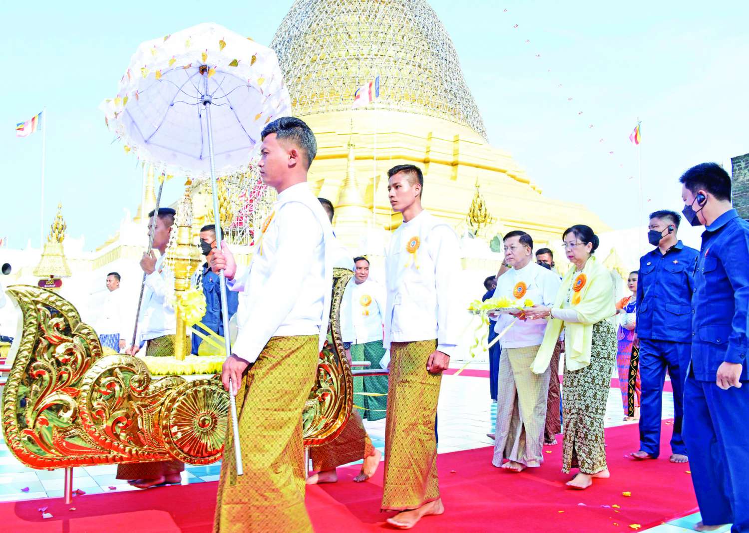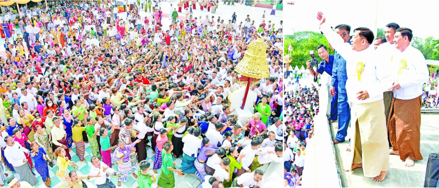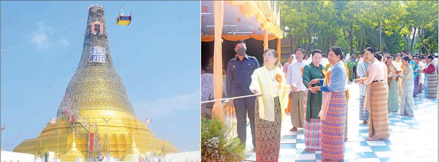 ယင်းနောက် နိုင်ငံတော်စီမံအုပ်ချုပ်ရေးကောင်စီဥက္ကဋ္ဌ နိုင်ငံတော်ဝန်ကြီးချုပ်နှင့်ဇနီး၊ အဖွဲ့ဝင်များသည် ရတနာစိန်ဖူးတော်၊ ငှက်မြတ်နားတော်တို့ကို မင်္ဂလာဝေါယာဉ်တော်ဖြင့် ပင့်ဆောင်၍ စေတီတော်မြတ်ကြီးအား လက်ယာရစ်လှည့်လည်ပူဇော်ကာ မဟာမင်္ဂလာမဏ္ဍပ်တော်ကြီးရှေ့ရှိ ခေတ္တအပူဇော်ခံနေရာသို့ ပို့ဆောင်ကြသည်။ ထို့နောက် မင်္ဂလာအချိန်တွင် နိုင်ငံတော်စီမံအုပ်ချုပ်ရေးကောင်စီဥက္ကဋ္ဌ နိုင်ငံတော်ဝန်ကြီးချုပ်၏ ဇနီးနှင့်အဖွဲ့ဝင်များ၊ အခမ်းအနား တက်ရောက်လာကြသူများနှင့် ဒေသခံတိုင်းရင်းသားပြည်သူလူထုတို့က မင်္ဂလာကြိုးဆွဲ၍ ရတနာစိန်ဖူးတော်၊ ငှက်မြတ်နားတော်တို့အား မင်္ဂလာရထားပျံဖြင့် စေတီတော်အထွတ်သို့ ပင့်ဆောင်ကြသည်။ ဆက်လက်၍ နိုင်ငံတော်စီမံအုပ်ချုပ်ရေးကောင်စီဥက္ကဋ္ဌ နိုင်ငံတော်ဝန်ကြီးချုပ်နှင့်အဖွဲ့ဝင်များက ရတနာစိန်ဖူးတော်၊ ငှက်မြတ်နားတော်တို့ကို စေတီတော်အထွတ်၌ တင်လှူပူဇော်၍ ပရိတ်နံ့သာရည်များ ပက်ဖျန်းကြသည်။ ယင်းနောက် ရတနာစိန်ဖူးတော်၊ ငှက်မြတ်နားတော် တင်လှူပူဇော်အောင်မြင်ခြင်းအထိမ်းအမှတ်အဖြစ် ရတနာ ရွှေမိုး၊ ငွေမိုးများ ရွာသွန်းဖြိုးကြသည်။