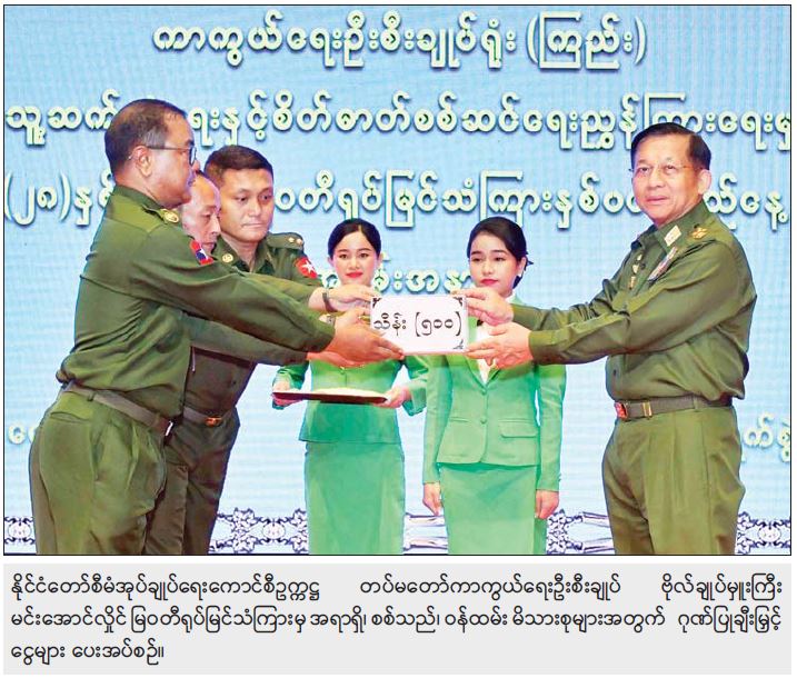 ဆက်လက်၍ နိုင်ငံတော်စီမံအုပ်ချုပ်ရေးကောင်စီဥက္ကဋ္ဌ တပ်မတော်ကာကွယ်ရေးဦးစီးချုပ်က မြဝတီရုပ်မြင်သံကြားမှ အရာရှိ၊ စစ်သည်၊ ဝန်ထမ်းမိသားစုများအတွက် ဂုဏ်ပြုချီးမြှင့်ငွေများကိုပေးအပ်ရာ ပြည်သူ့ဆက်ဆံရေးနှင့် စိတ်ဓာတ်စစ်ဆင်ရေး ညွှန်ကြားရေးမှူးရုံး၊ ညွှန်ကြားရေးမှူးနှင့် တာဝန်ရှိသူများက လက်ခံရယူသည်။
