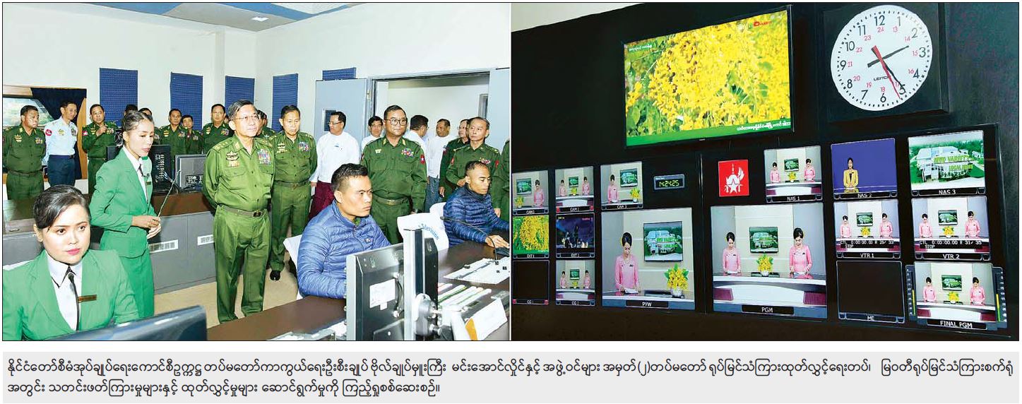 အခမ်းအနားအပြီးတွင် နိုင်ငံတော်စီမံအုပ်ချုပ်ရေးကောင်စီဥက္ကဋ္ဌ တပ်မတော်ကာကွယ်ရေးဦးစီး ချုပ်နှင့် အဖွဲ့ဝင်များသည် အမှတ်(၂)တပ်မတော် ရုပ်မြင်သံကြားထုတ်လွှင့်ရေးတပ်၊ မြဝတီရုပ်မြင် သံကြားစက်ရုံအတွင်း လှည့်လည်၍ သရုပ်ပြသရိုက်ကူးမှုများ၊ Production Studio၊ News Studio၊ Presentation Room တို့အတွင်း သတင်းဖတ်ကြားမှုများနှင့် ထုတ်လွှင့်မှုများ ဆောင်ရွက်မှုတို့ကို ကြည့်ရှုစစ်ဆေးပြီးတာဝန်ရှိသူများ၏ ရှင်းလင်းတင်ပြမှုများအပေါ် မီဒီယာအခန်းကဏ္ဍသည် စဉ်ဆက်မပြတ်တိုးတက်နေသဖြင့် ခေတ်နှင့်လျော်ညီသည့် နည်းပညာနှင့် တင်ဆက်မှုများဖြစ်အောင် ကြိုးပမ်းဆောင်ရွက်ရန်၊ သတင်းများထုတ်လွှင့်ရာတွင် တည်းဖြတ်မှုများနှင့် ထုတ်လွှင့်မှုများ မှန်ကန်မှုရှိအောင် စနစ်တကျဖြင့် ဆောင်ရွက်ရန်နှင့် အခြား လိုအပ်သည်များကို မှာကြားသည်။